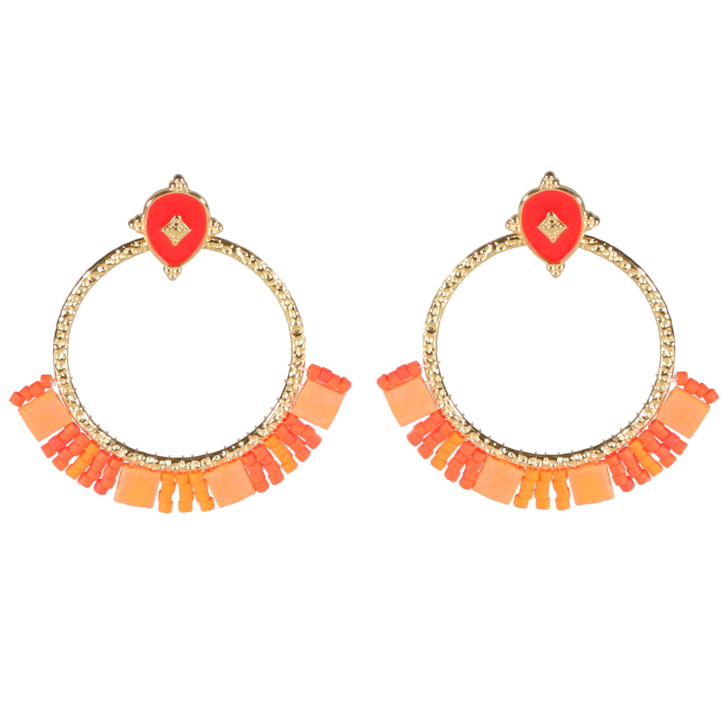 Boucles d'oreilles pendantes composées d'une puce de forme ovale en acier doré et pavée d'émail de couleur rouge et un cercle martelé en acier doré avec éventail de perles de couleur rouge.