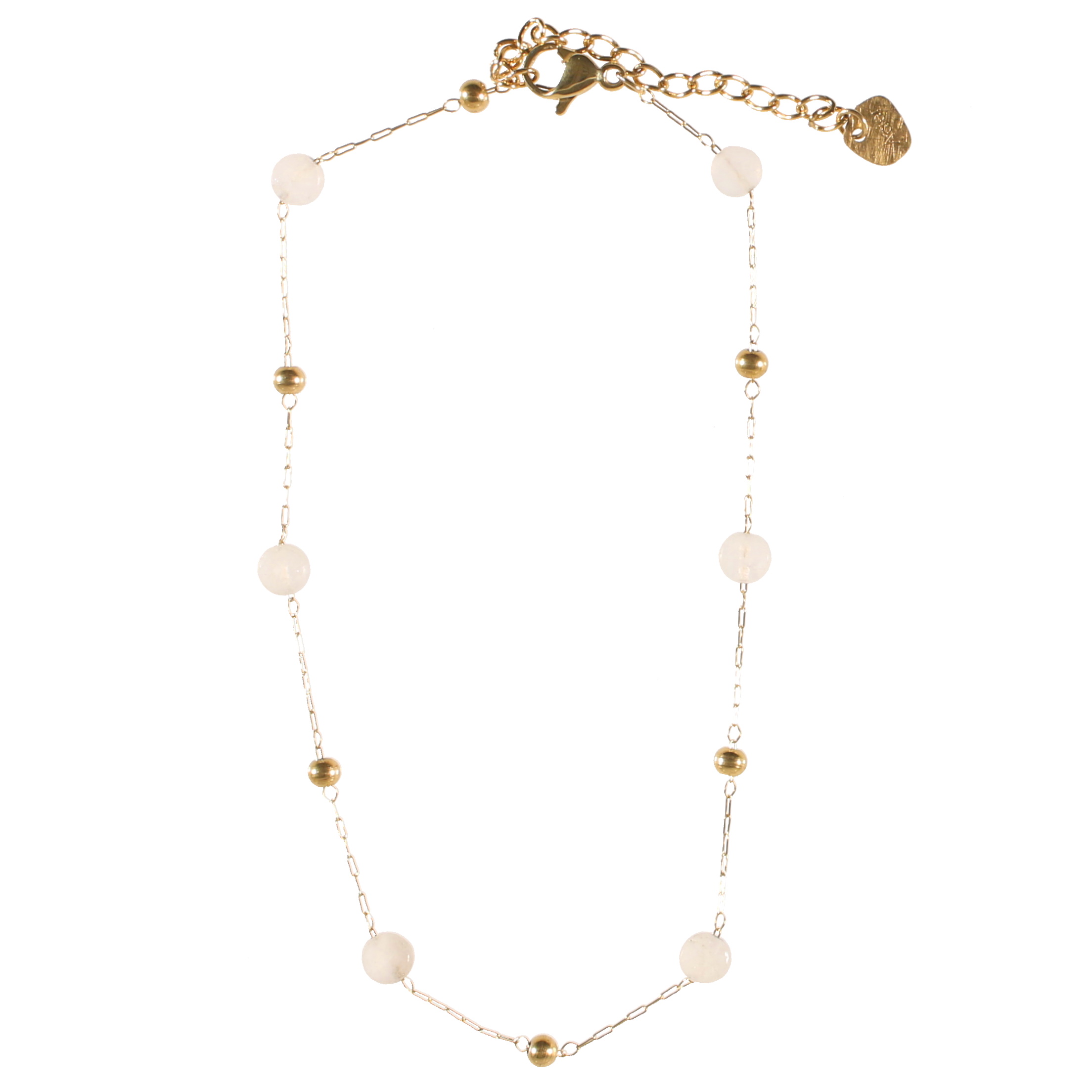 Bracelet chaîne de cheville composé d'une chaîne avec perles en acier doré et de perles en véritable pierre de jade blanc.