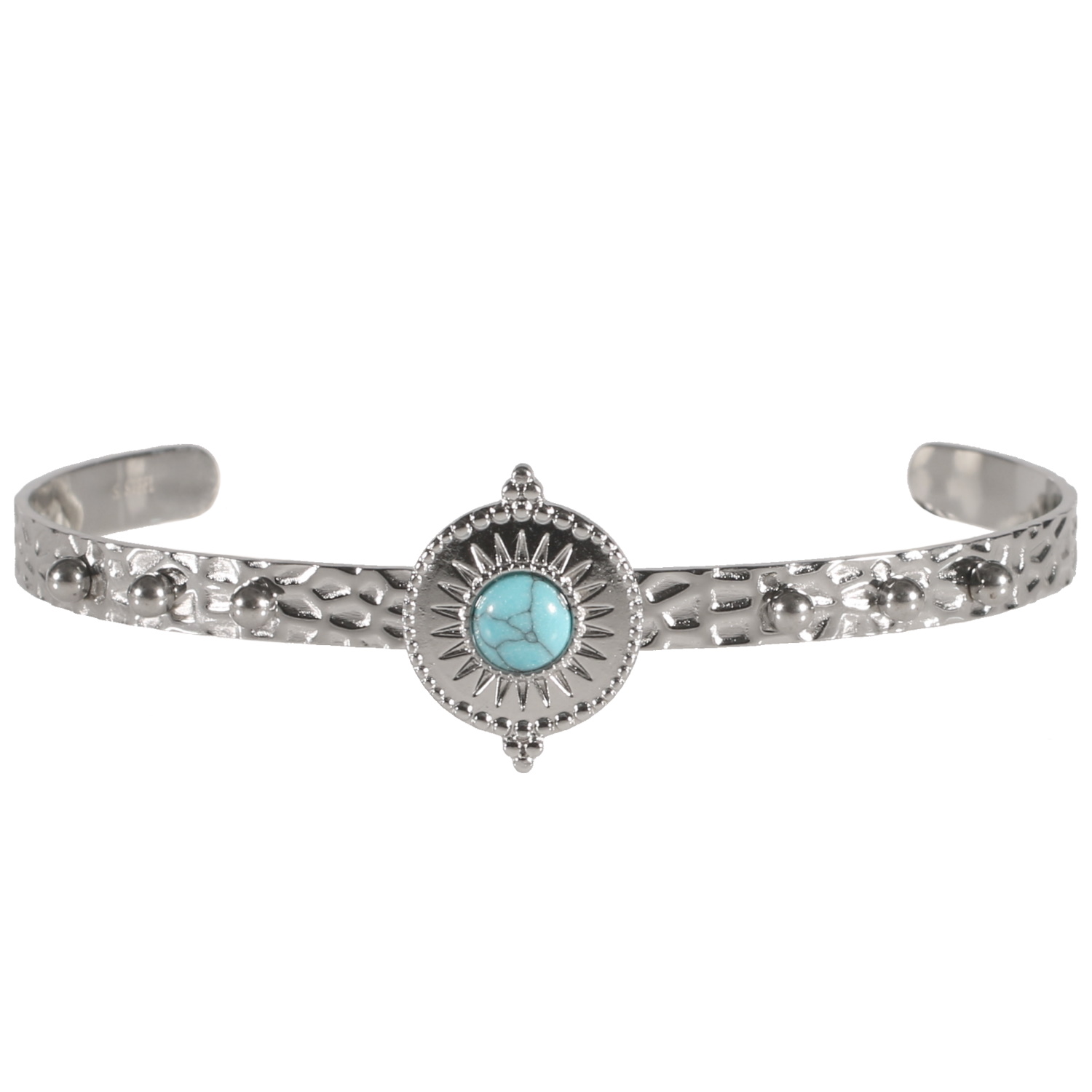 Description Bracelet jonc ouvert martelé en acier argenté surmonté d'une pastille ronde avec dessins de rayon sertie d'une pierre d'imitation turquoise. Cliquez sur une matière, un thème, une couleur ou une collection pour voir tous les articles associés.