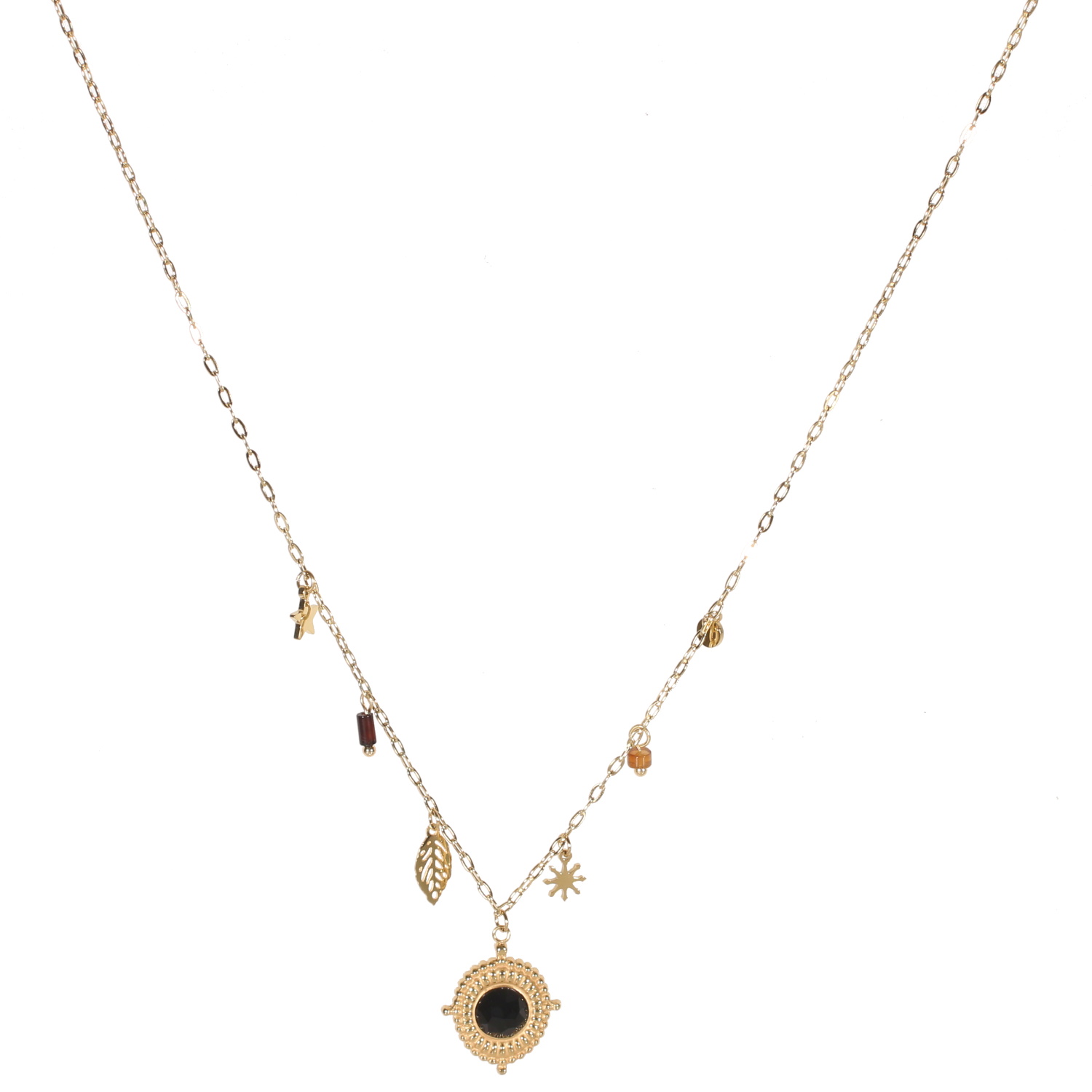 Collier composé d'une chaîne avec pendants feuille, étoile, pastille ronde en acier doré, des perles pendantes en véritable pierre d'agate noire et d'un pendentif ovale en acier doré surmonté d'une véritable pierre d'agate noire.