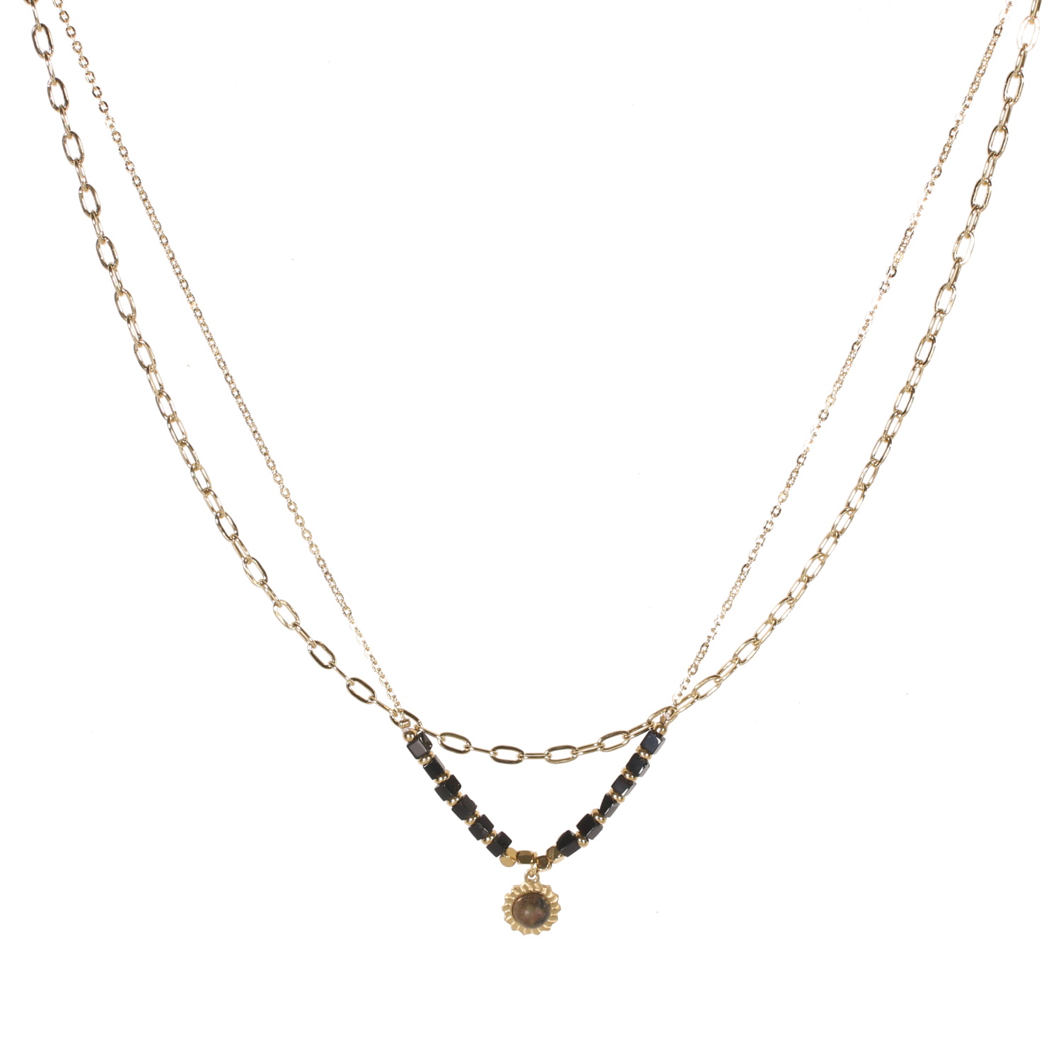 Collier double rangs composé d'une chaîne de 39 cm de long en acier doré, ainsi qu'une chaîne de 40 cm de long en acier doré surmontée de perles cubiques en véritable pierre d'agate noire et d'un pendentif rond soleil en acier doré surmonté d'une véritable pierre d'agate noire.