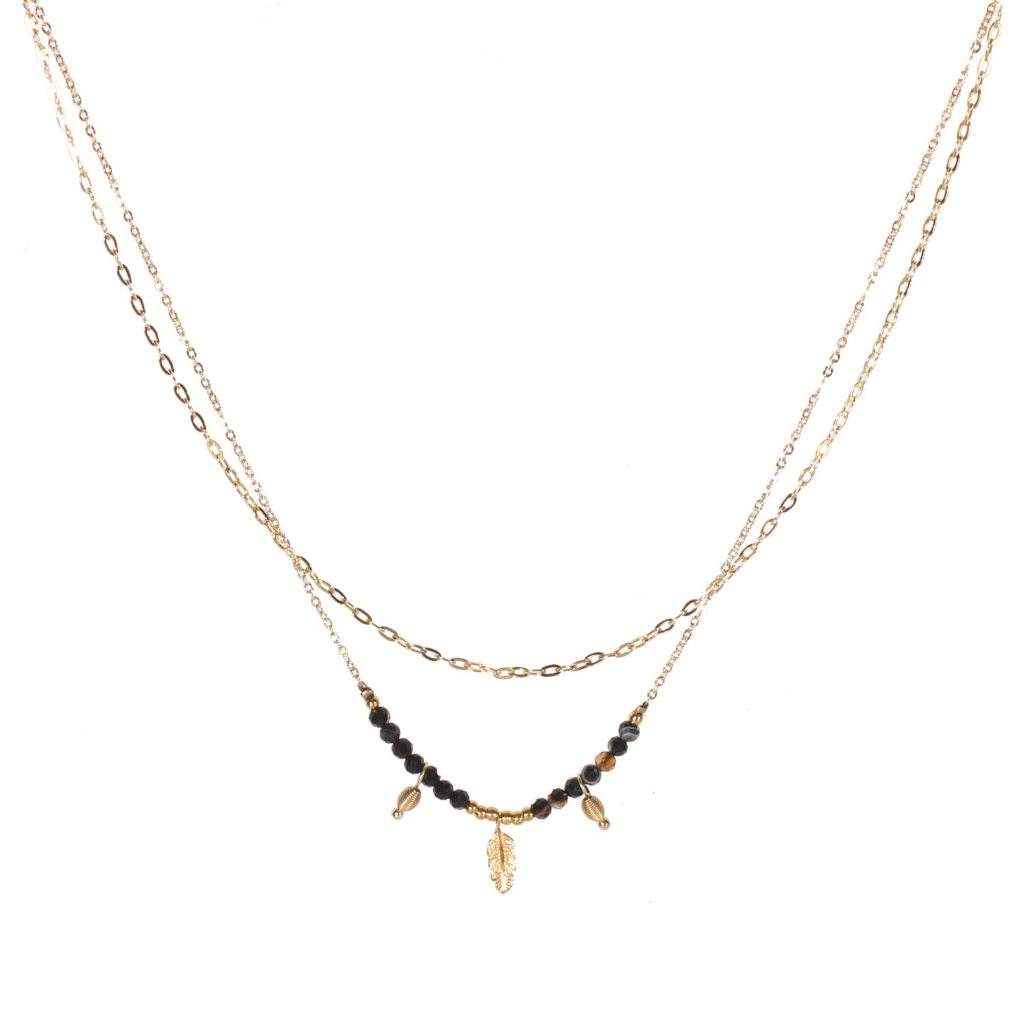 Collier double rangs composé d'une chaîne de 39 cm de long en acier doré, ainsi qu'une chaîne de 40 cm de long avec deux pendants en acier doré surmontée de perles en véritable pierre d'agate noire et d'un pendentif plume en acier doré.