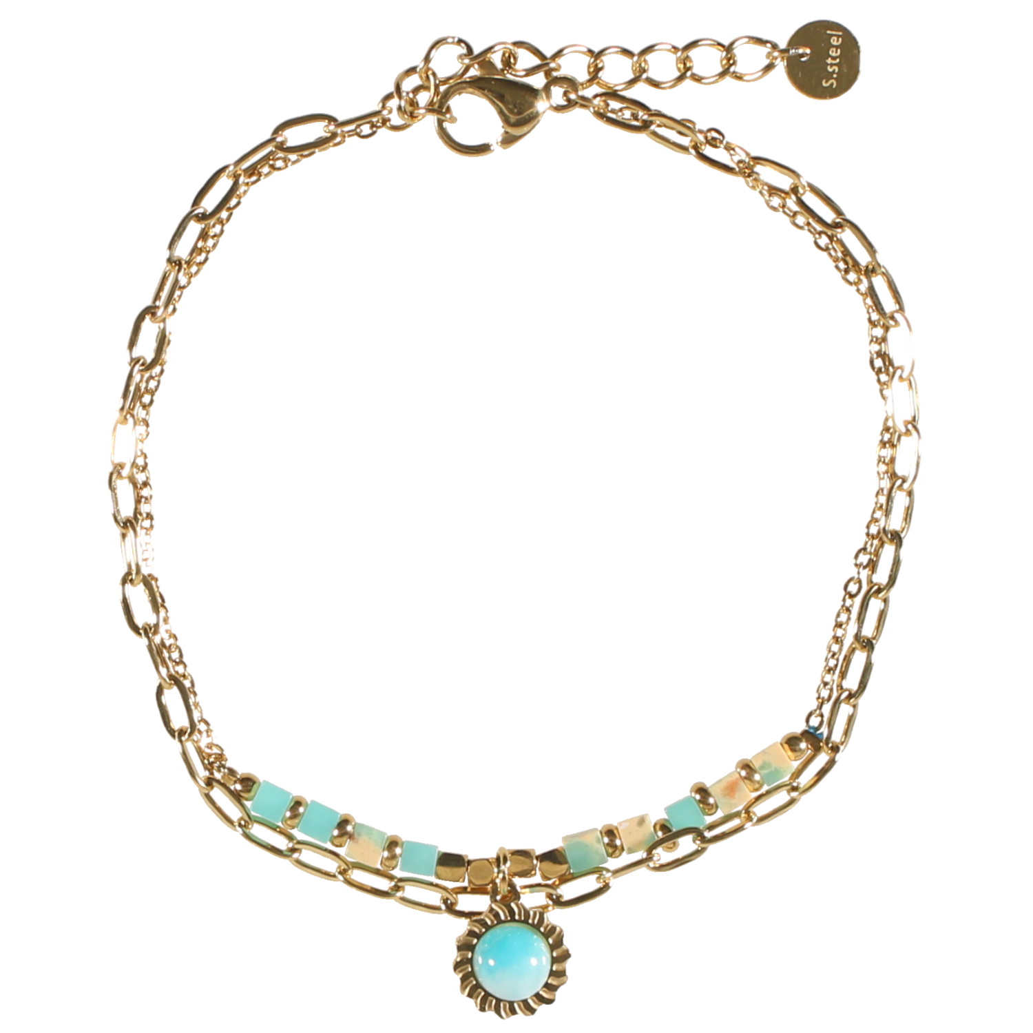 Bracelet double rangs composé d'une chaîne en acier doré, ainsi qu'une chaîne en acier doré surmontée de perles cubiques en véritable pierre d'amazonite et d'une pastille ronde pendante en acier doré sertie d'une véritable pierre d'amazonite.