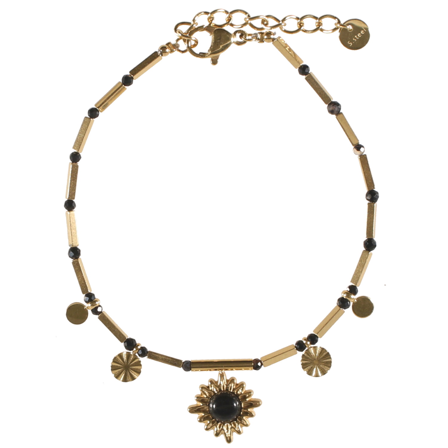 Bracelet avec pampilles rondes en acier doré, perles en véritable pierre d'agate et un pendant soleil en acier doré surmonté d'une pierre d'agate.
