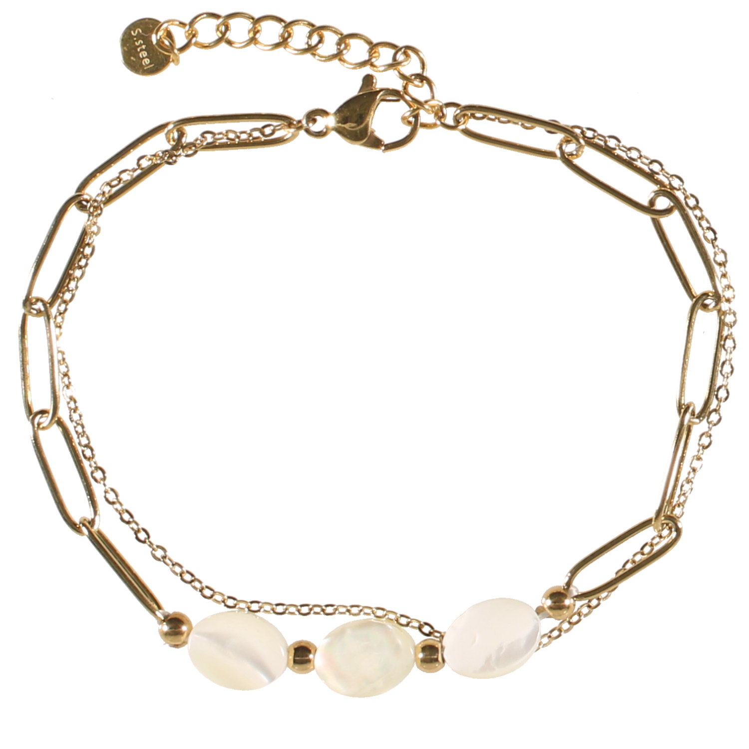 Bracelet double rangs composé d'une chaîne en acier doré et d'une chaîne en acier doré avec 3 perles de nacre.<br/>Fermoir mousqueton en acier doré avec 3 cm de rallonge. Multirangs Ovale Perle  Adolescent Adulte Femme Fille Indémodable