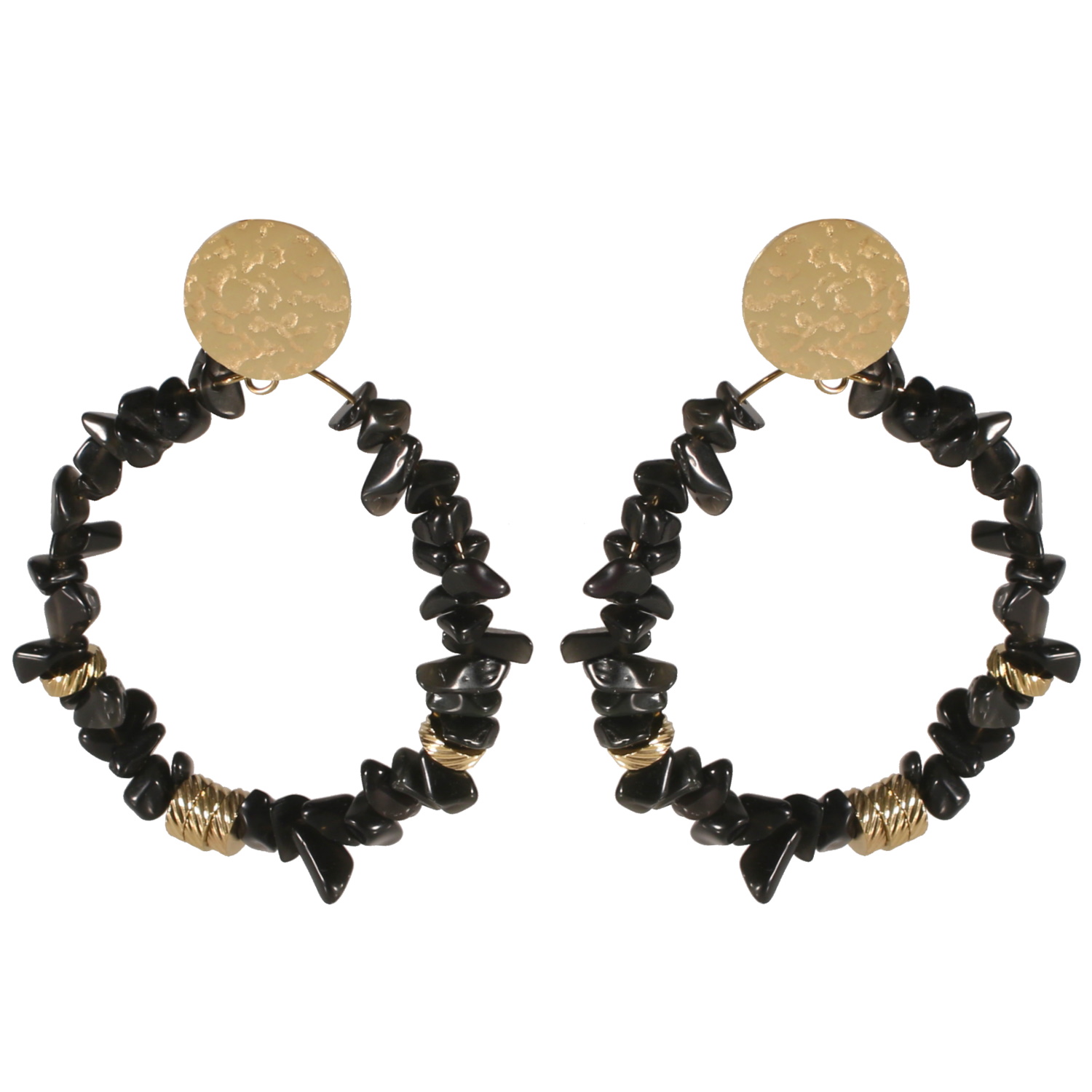 Boucles d'oreilles pendantes composées d'une pastille ronde martelée en acier doré et d'un cercle surmonté de perles cylindriques en acier doré et de perles en véritable pierre d'agate noire.