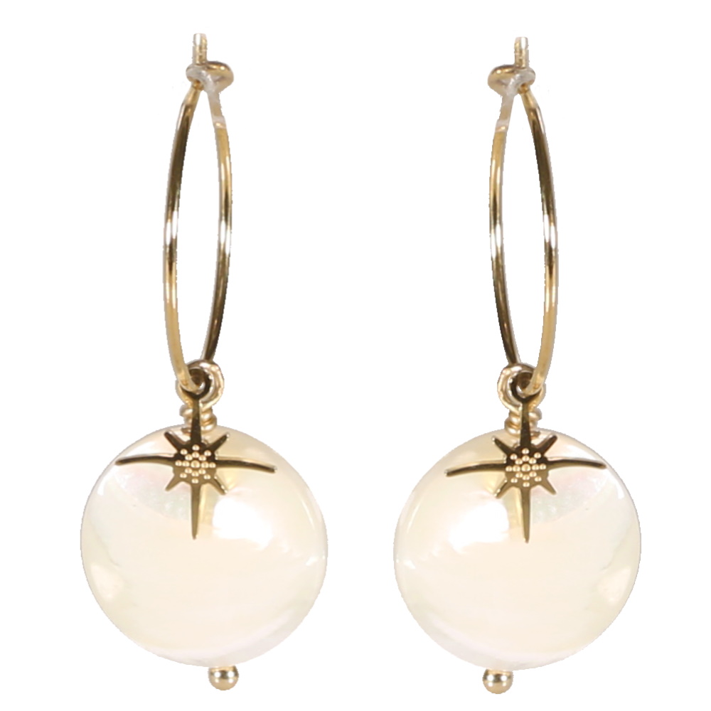 Boucles d'oreilles créoles avec un pendant étoile en acier doré et une pastille ronde de nacre.