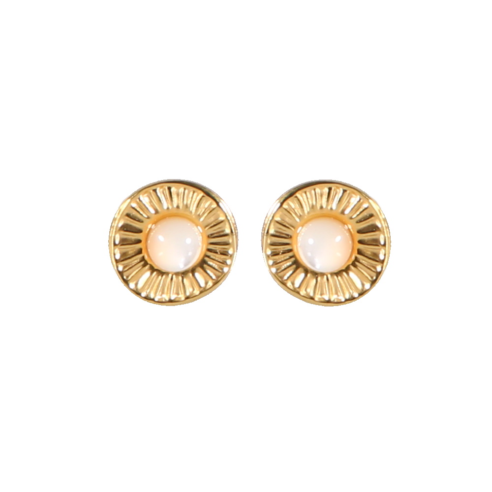 Boucles d'oreilles puces rondes avec motif en acier doré surmontées d'une coquille de nacre.