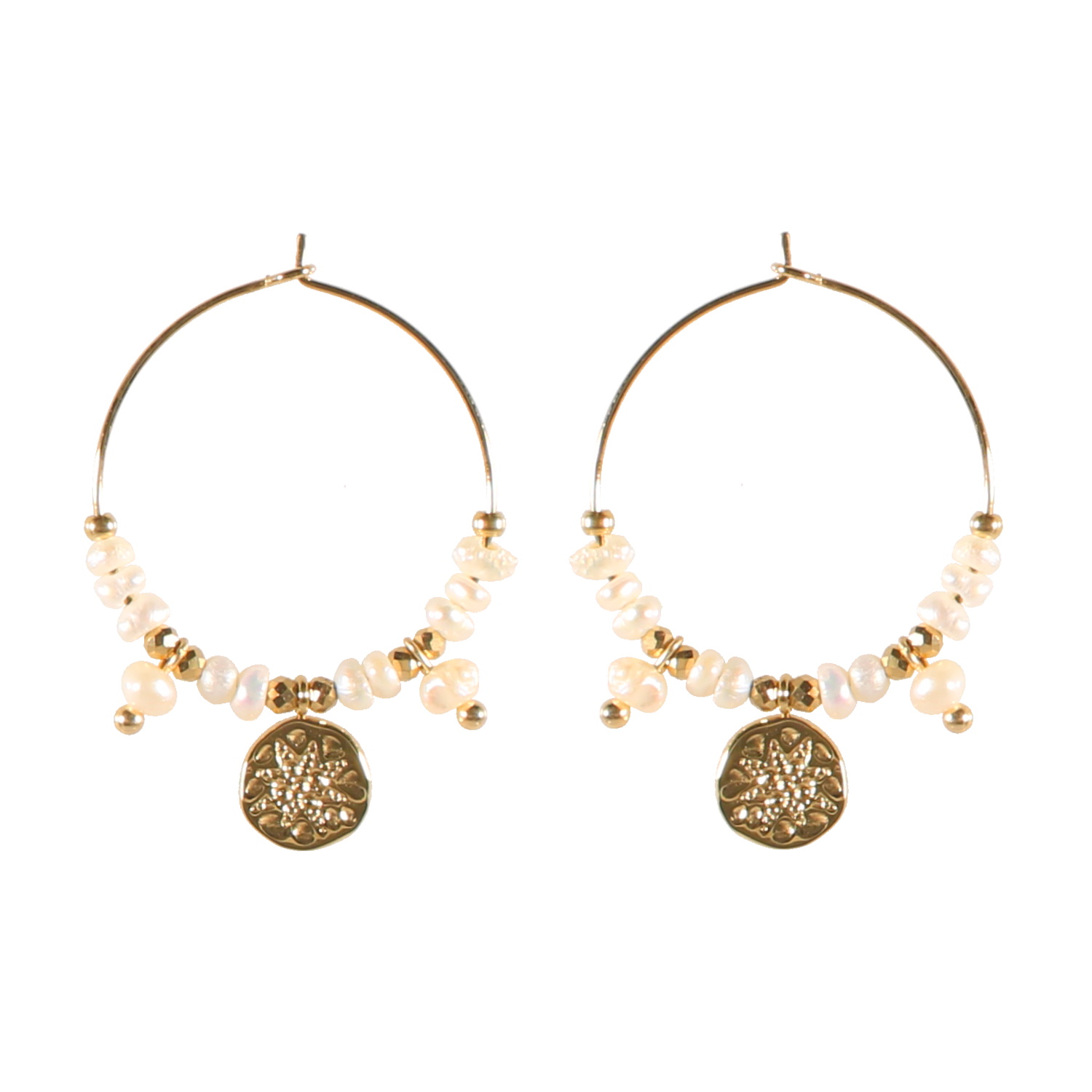 Boucles d'oreilles créoles surmontées de perles cylindriques en acier doré, de perles en nacre et d'une pastille martelée d'une étoile en acier doré.