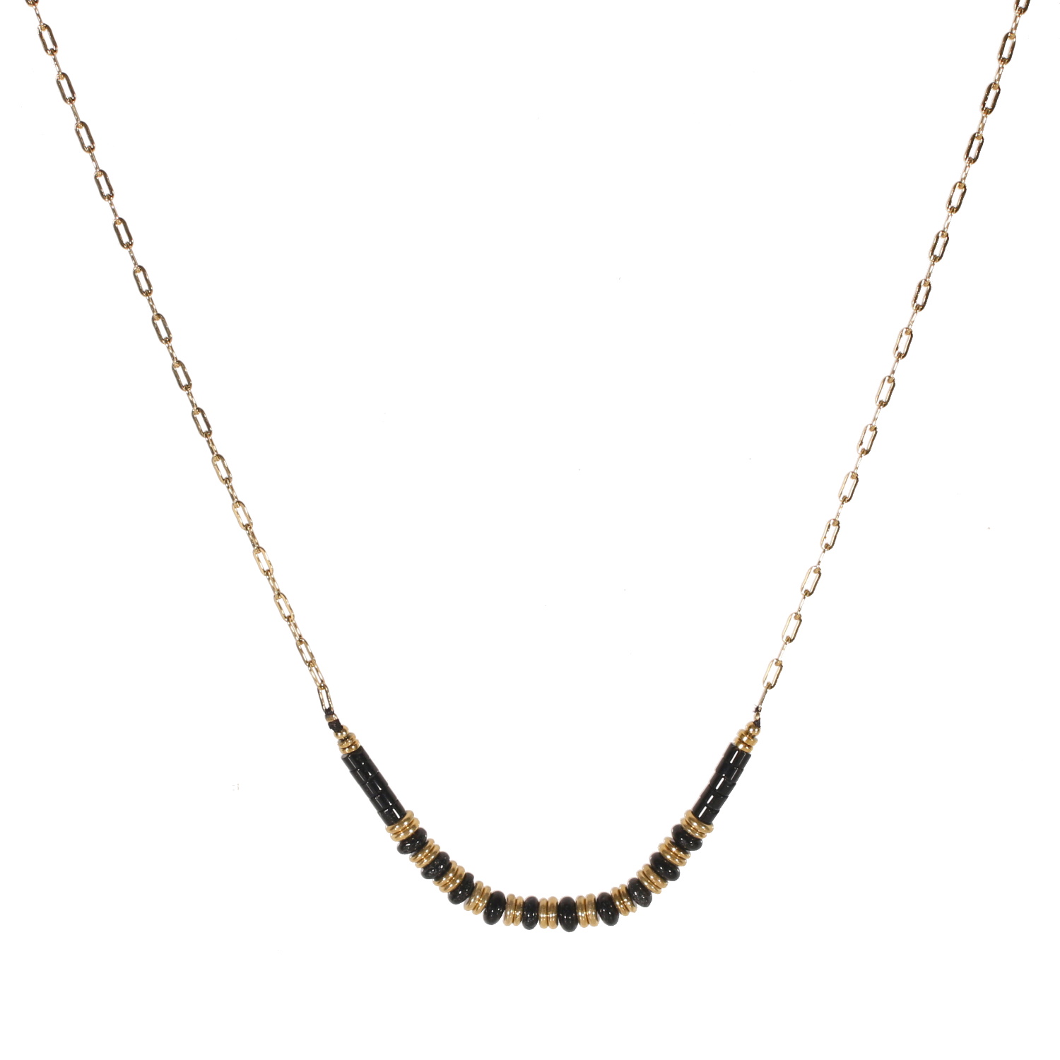 Collier composé d'une chaîne et de perles cylindriques en acier doré et de perles cylindriques en véritable pierre d'agate.