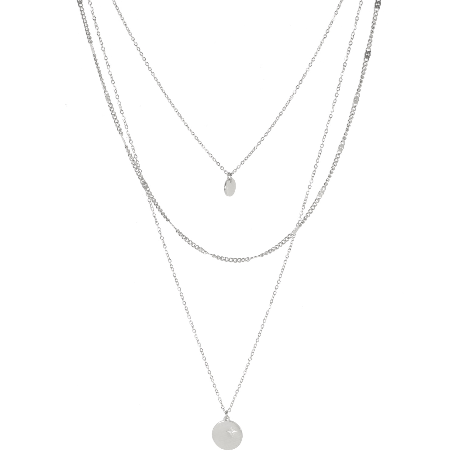 Description Collier sautoir triple rangs composé d'une chaîne de 38 cm de long avec pendentif pastille ronde en acier argenté, d'une chaîne de 44 cm de long en acier argenté, ainsi qu'une chaîne de 57 cm de long avec pendentif pastille ronde au dessin d'étoile en acier argenté. Fermoir mousqueton avec 7 cm de rallonge. Longueur 38+7 cm [Guide des tailles] Matière(s) Acier . L'acier utilisé dans la bijouterie existe sous plusieurs qualités. Nous utilisons principalement la qualité 316L, qualité qui est utilisée en chirurgie. Cet acier est donc inoxydable et reste très résistant. Fermoir Mousqueton À noter Pendentifs 7 mm et 12 mm de diamètre Couleur(s) dominante(s) Argenté Public Adolescent , Adulte . Genre Femme , Fille . Saison Indémodable . Thème(s) Nature . Collection Astre sublime Cliquez sur une matière, un thème, une couleur ou une collection pour voir tous les articles associés.