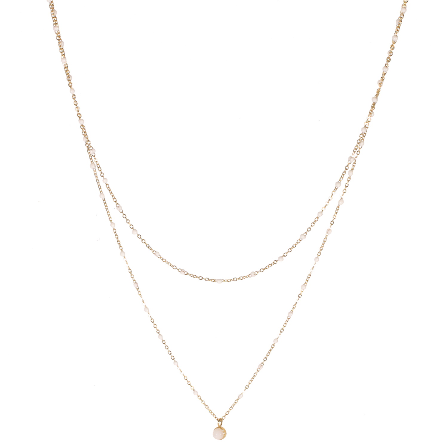 Collier double rangs composé d'une chaîne de 38 cm de long en acier doré et perles en émail de couleur blanche, ainsi qu'une chaîne de 46 cm de long en acier doré avec perles en émail de couleur blanche et d'un pendentif surmonté d'une véritable pierre de jade blanc.