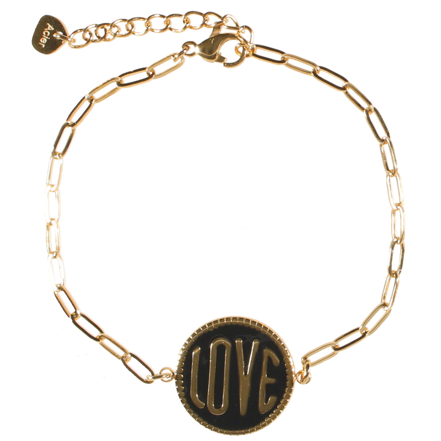 Description Bracelet composé d'une chaîne en acier doré et d'une pastille ronde pavée d'émail de couleur blanche et du mot Love en acier doré. Fermoir mousqueton avec 3 cm de rallonge. Longueur 16+3 cm [Guide des tailles] Largeur 15 mm Matière(s) Acier , Email . L'acier utilisé dans la bijouterie existe sous plusieurs qualités. Nous utilisons principalement la qualité 316L, qualité qui est utilisée en chirurgie. Cet acier est donc inoxydable et reste très résistant. Fermoir Mousqueton Couleur(s) dominante(s) Doré , Noir Public Adolescent , Adulte . Genre Femme , Fille . Saison Indémodable . Cliquez sur une matière, un thème, une couleur ou une collection pour voir tous les articles associés.