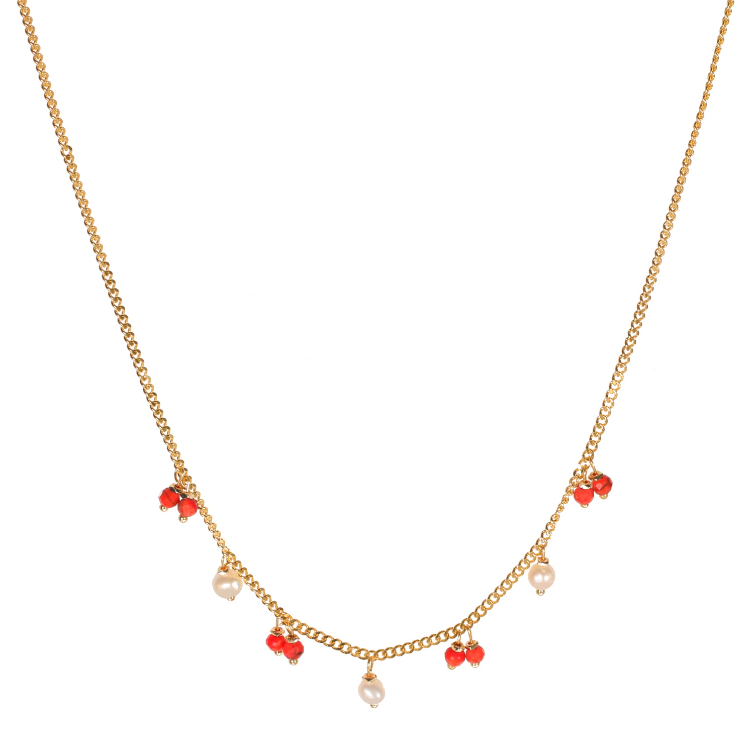 Collier composé d'une chaîne en acier doré avec pampilles en perles de couleur rouge et perles de nacre.