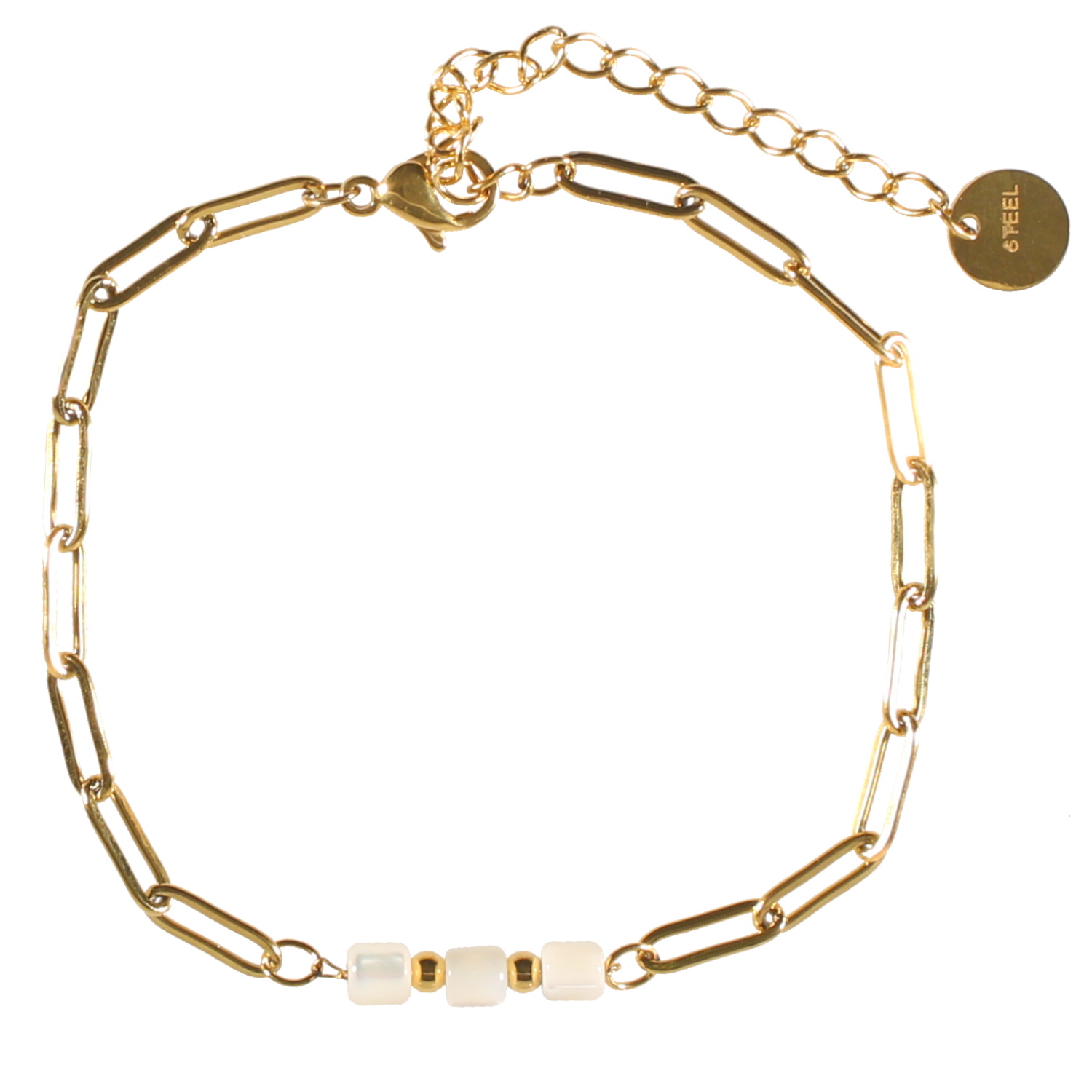 Description Bracelet composé d'une chaîne en acier doré et de trois perles cylindriques en nacre. Fermoir mousqueton avec 5 cm de rallonge. Longueur 16+5 cm [Guide des tailles] Largeur 3 mm Matière(s) Acier , Nacre . L'acier utilisé dans la bijouterie existe sous plusieurs qualités. Nous utilisons principalement la qualité 316L, qualité qui est utilisée en chirurgie. Cet acier est donc inoxydable et reste très résistant. Fermoir Mousqueton Couleur(s) dominante(s) Blanc , Doré Public Adolescent , Adulte . Genre Femme , Fille . Saison Indémodable . Cliquez sur une matière, un thème, une couleur ou une collection pour voir tous les articles associés.