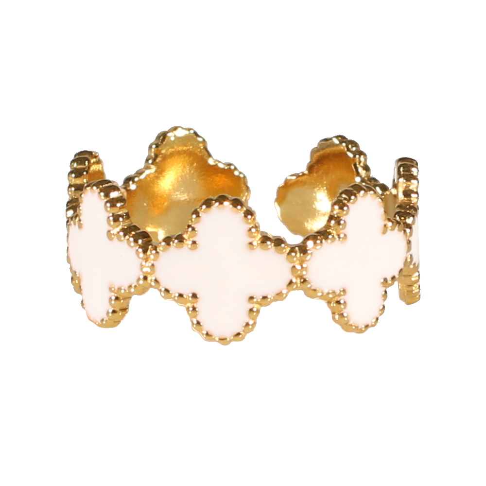 Description Bague en acier doré et de trèfles pavés d'émail de couleur blanche. Taille ajustable. Largeur 8 mm Matière(s) Acier , Email . L'acier utilisé dans la bijouterie existe sous plusieurs qualités. Nous utilisons principalement la qualité 316L, qualité qui est utilisée en chirurgie. Cet acier est donc inoxydable et reste très résistant. Couleur(s) dominante(s) Blanc , Doré Public Adolescent , Adulte . Genre Femme , Fille . Saison Indémodable . Thème(s) Nature . Cliquez sur une matière, un thème, une couleur ou une collection pour voir tous les articles associés.