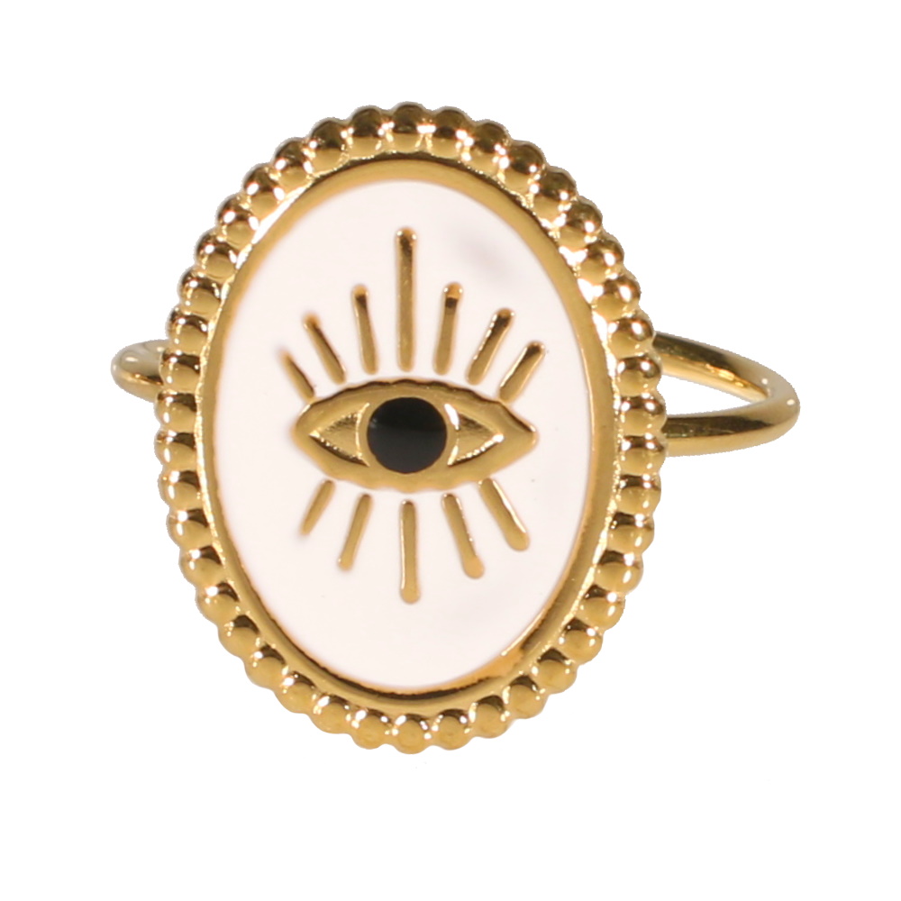 Bague en acier doré surmontée d'une pastille ovale pavée d'émail de couleur blanche et d'un œil de Turquie en acier doré.