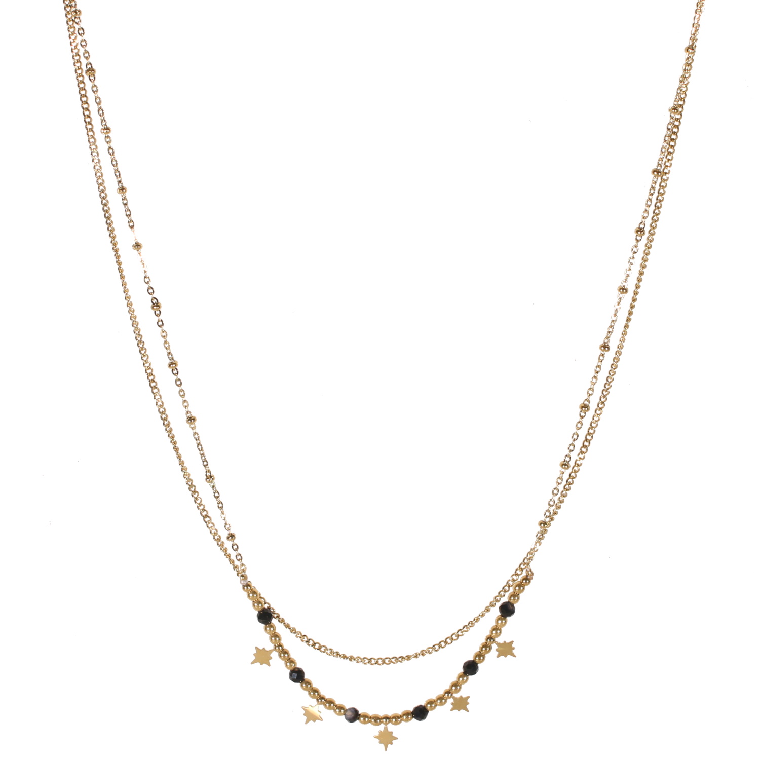 Collier double rangs composé d'une chaîne de 39 cm de long en acier doré, ainsi qu'une chaîne de 41 cm de long avec pendants en forme d'étoile en acier doré et perles en véritable pierre d'agate.