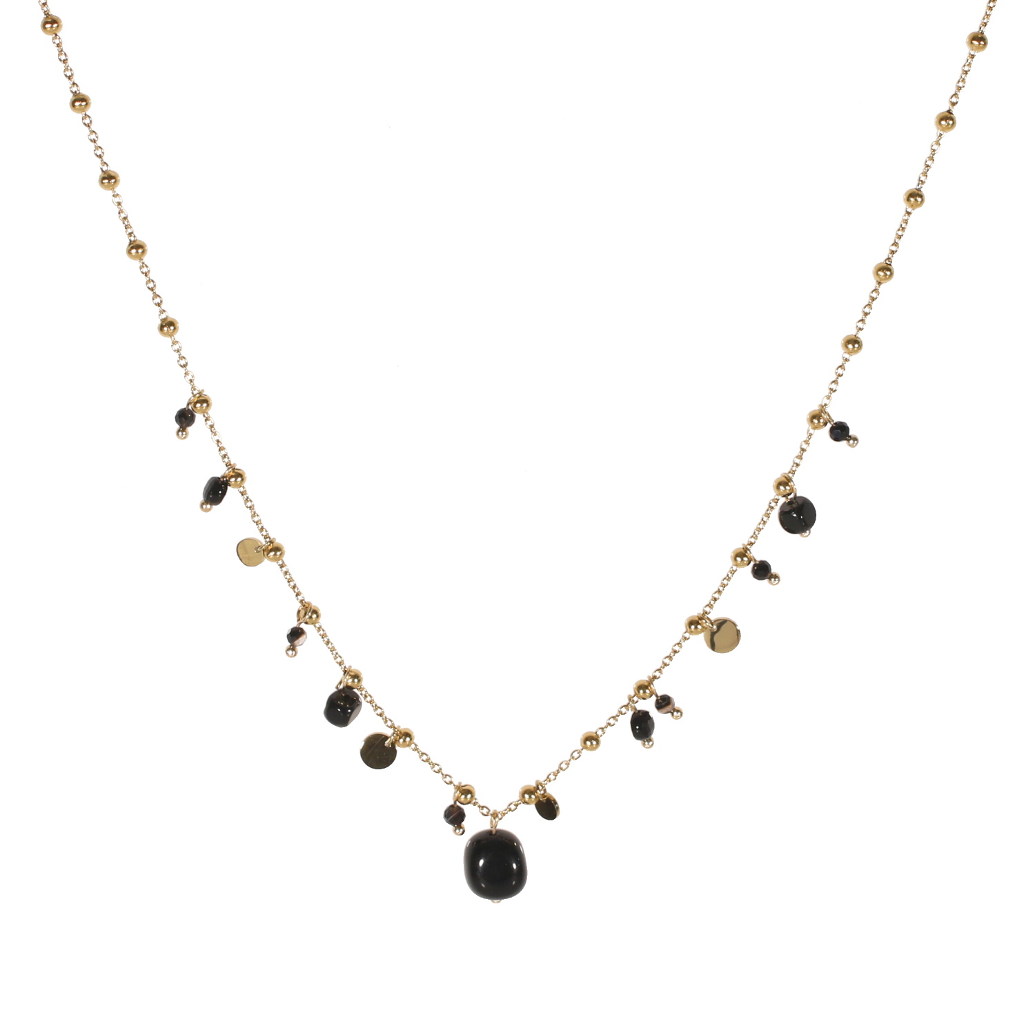 Collier composé d'une chaîne boules avec pampilles rondes lisses en acier doré et pampilles en véritable pierre d'agate.