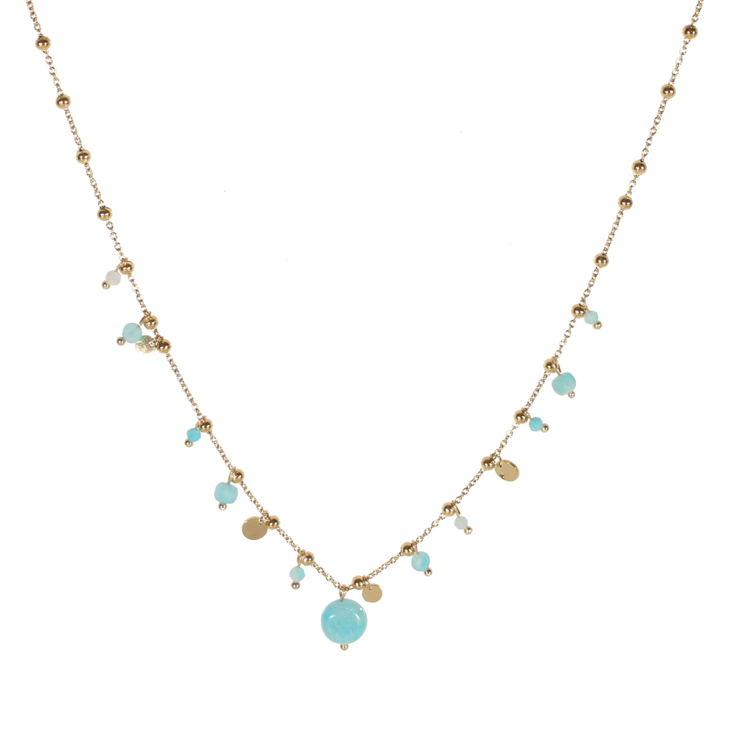 Collier composé d'une chaîne boules avec pampilles rondes lisses en acier doré et pampilles en véritable pierre d'amazonite.