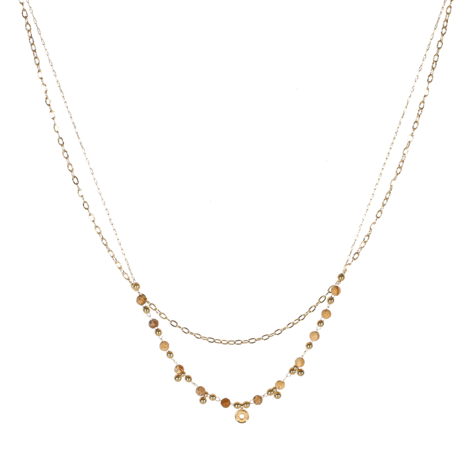 Collier double rangs composé d'une chaîne de 39 cm de long en acier doré, ainsi qu'une chaîne de 41 cm de long avec perles en acier doré surmontée de perles en véritable pierre de jaspe paysage et d'un pendentif cercle.