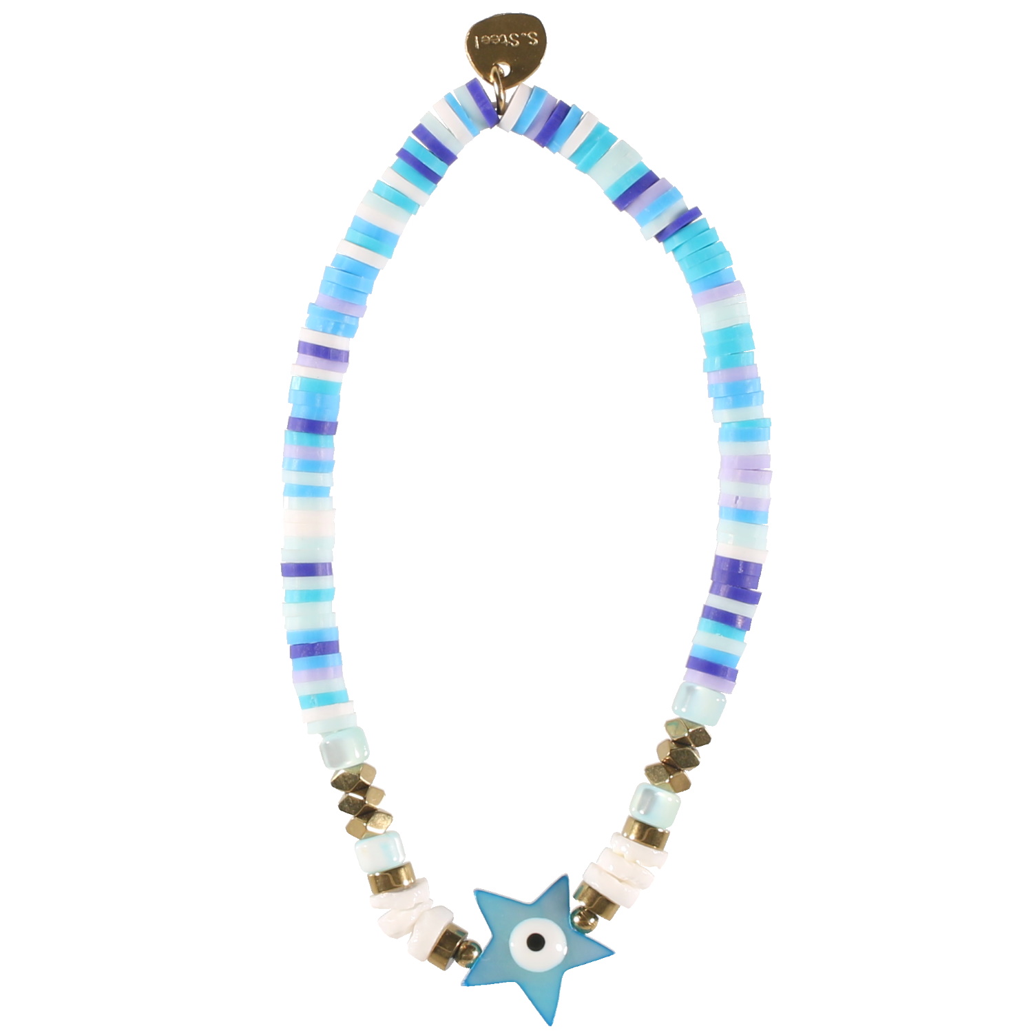 Bracelet élastique composé de perles en acier doré, de perles cylindriques heishi en résine synthétique et en caoutchouc de couleur acidulée, ainsi qu'une étoile en nacre avec un œil de Turquie en émail.