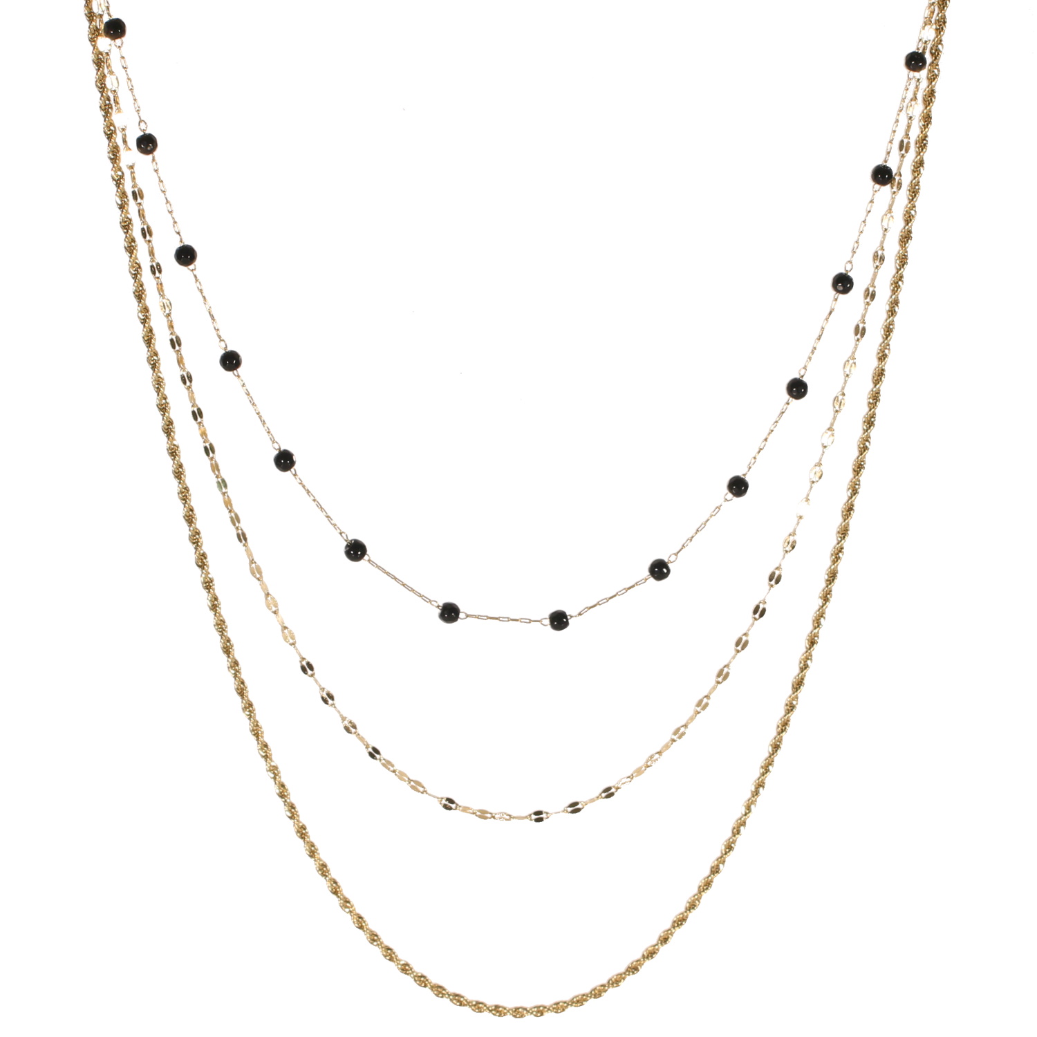 Collier triple rangs composé d'une chaîne de 39 cm de long en acier doré avec des perles en véritable pierre d'agate, d'une chaîne de 44 cm de long en acier doré, ainsi qu'une chaîne de 50 cm de long en acier doré.