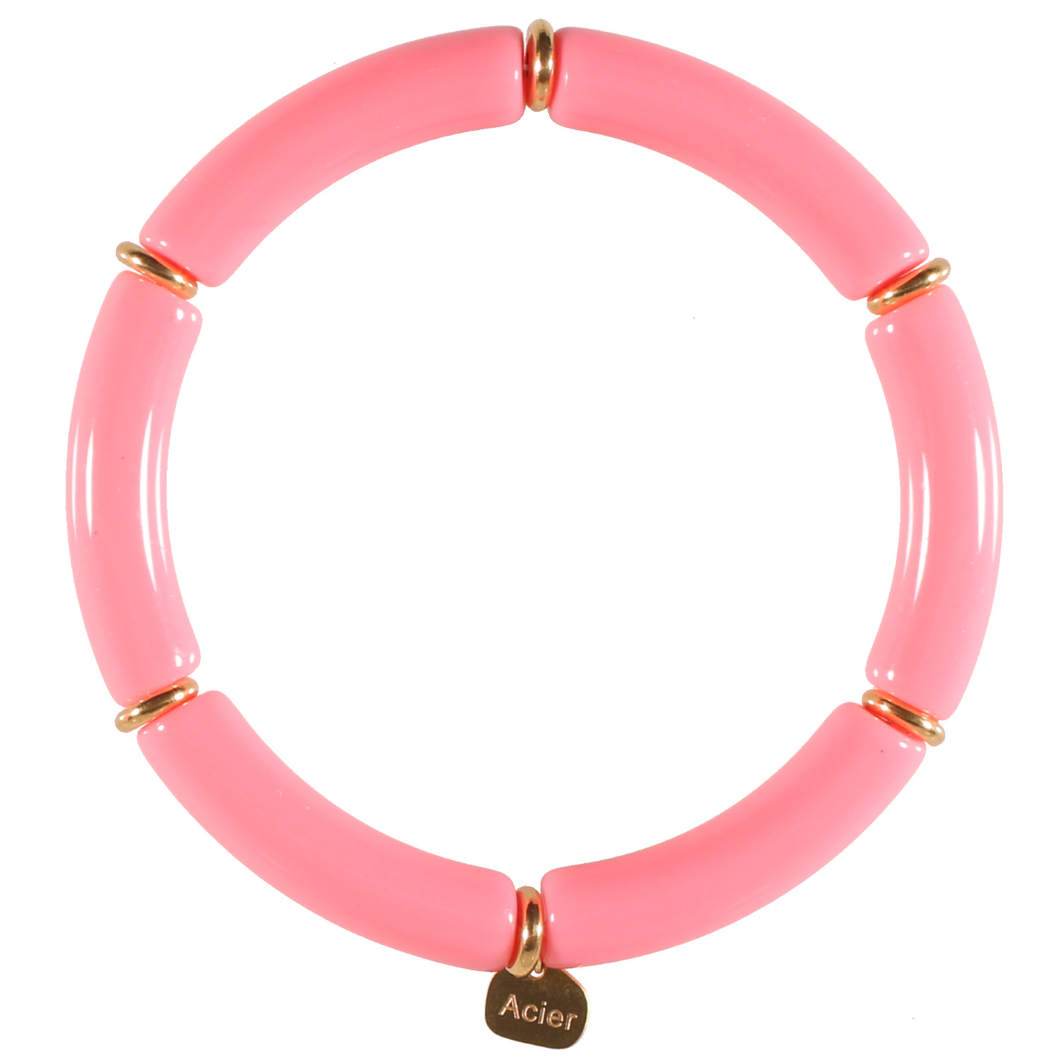 Bracelet jonc élastique composé d'un fil nylon, de perles cylindriques en acier doré et de tubes de couleur rose.