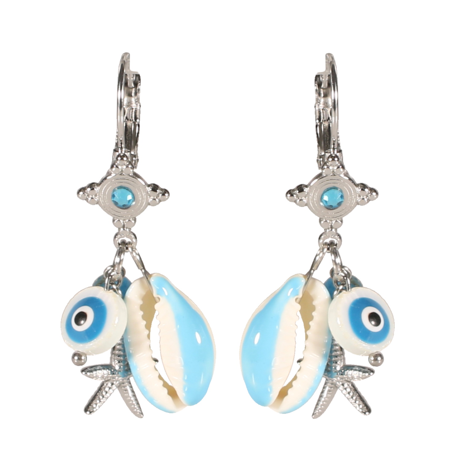 Boucles d'oreilles dormeuses pendantes composées d'une croix en acier argenté sertie d'un cristal de couleur bleue, d'un coquillage cauri peint d'émail de couleur bleue, un œil de Turquie en nacre et émail de couleur, une perle de couleur bleue et une étoile de mer en acier argenté.