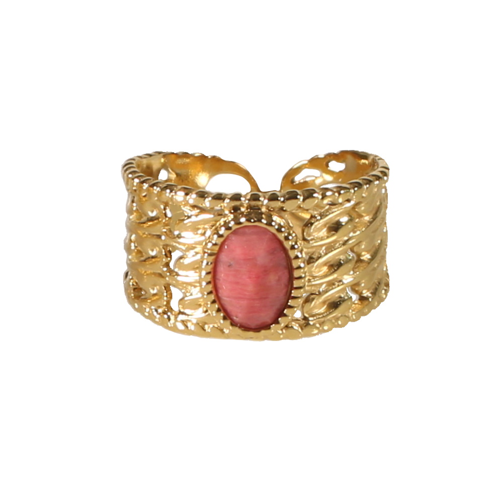 Description Bague en acier doré surmontée d'une véritable pierre de rhodonite sertie clos de forme ovale. Taille ajustable. Largeur 11 mm Matière(s) Acier , Pierre naturelle . L'acier utilisé dans la bijouterie existe sous plusieurs qualités. Nous utilisons principalement la qualité 316L, qualité qui est utilisée en chirurgie. Cet acier est donc inoxydable et reste très résistant. Fermoir Aucun Couleur(s) dominante(s) Doré , Rose Public Adolescent , Adulte . Genre Femme , Fille . Saison Indémodable . Cliquez sur une matière, un thème, une couleur ou une collection pour voir tous les articles associés.