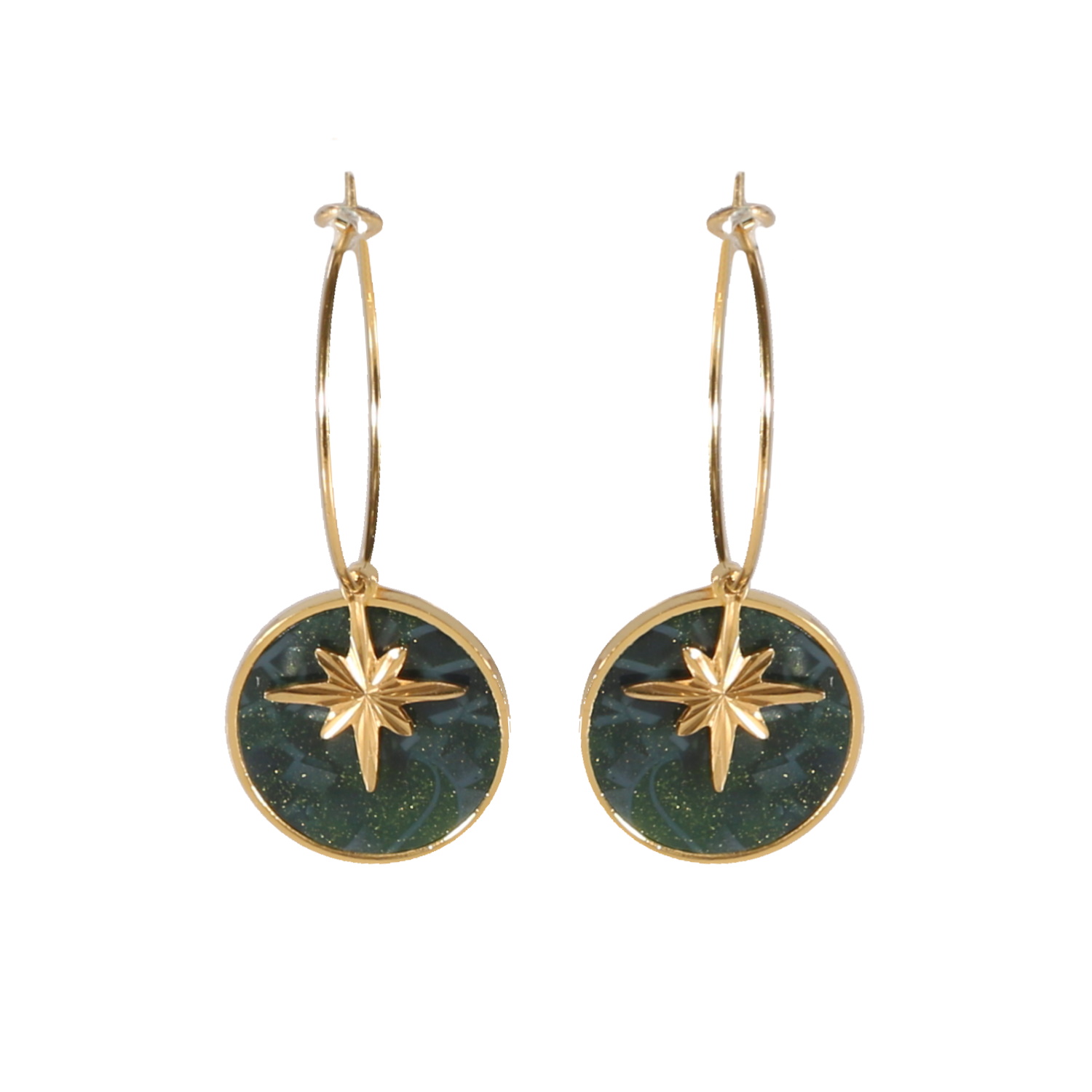 Boucles d'oreilles créoles avec pendant étoile en acier doré et une pastille ronde sertie d'une pierre de couleur verte.