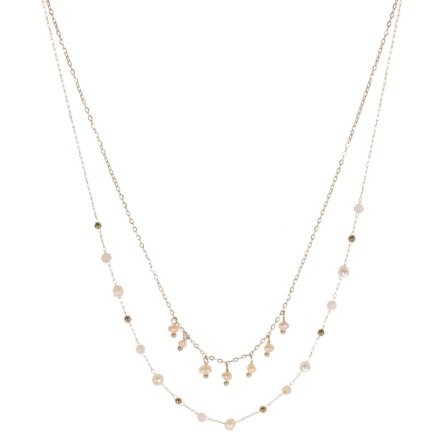 Collier double rangs composé d'une chaîne de 39 cm de long en acier doré et de pampilles perles de nacre, ainsi qu'une chaîne de 41 cm de long en acier doré avec des perles de couleur blanche et de nacre.