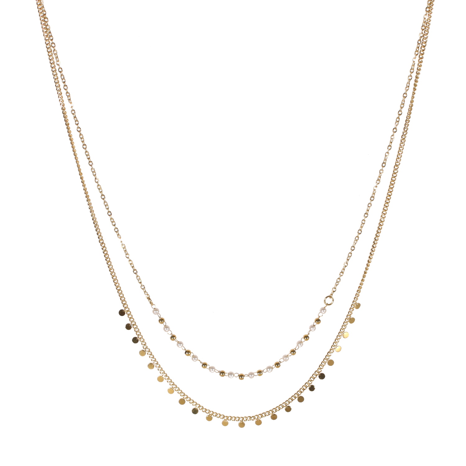Collier double rangs composé d'une chaîne de 39 cm de long avec perles en acier doré et mini perles de nacre, ainsi qu'une chaîne de 40 cm de long avec pampilles rondes en acier doré.