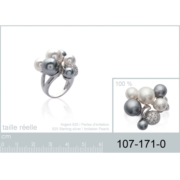 Bague en argent 925/000 rhodié et perles d'imitation.