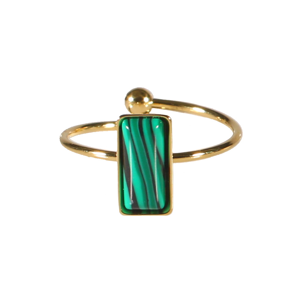 Bague en acier doré surmontée d'une véritable pierre de malachite sertie clos de forme rectangulaire.