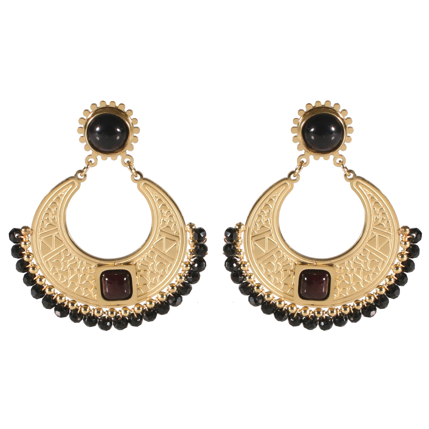 Description Boucles d'oreilles pendantes composées d'une puce au contour de pétales en acier doré sertie d'un cabochon de couleur noire et d'un cercle pendant avec motifs en acier doré serti d'un cabochon de forme carré de couleur noir et de pampilles perles de couleur noire. Largeur 40 mm Hauteur 45 mm Matière(s) Acier , Rocaille . L'acier utilisé dans la bijouterie existe sous plusieurs qualités. Nous utilisons principalement la qualité 316L, qualité qui est utilisée en chirurgie. Cet acier est donc inoxydable et reste très résistant. Fermoir Tiges poussettes Couleur(s) dominante(s) Doré , Noir Public Adolescent , Adulte . Genre Femme , Fille . Saison Indémodable . Cliquez sur une matière, un thème, une couleur ou une collection pour voir tous les articles associés.