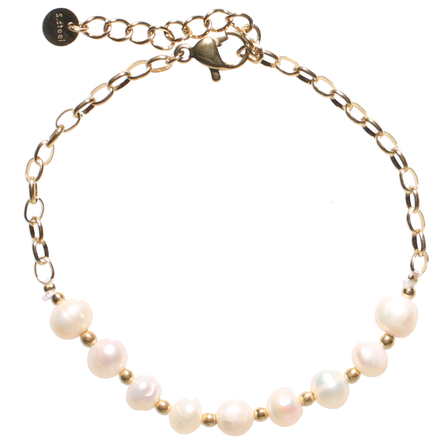 Description Bracelet composé d'une chaîne en acier doré et de perles de nacre. Fermoir mousqueton avec 3 cm de rallonge. Longueur 16+3 cm [Guide des tailles] Largeur 5 mm Matière(s) Acier , Nacre . L'acier utilisé dans la bijouterie existe sous plusieurs qualités. Nous utilisons principalement la qualité 316L, qualité qui est utilisée en chirurgie. Cet acier est donc inoxydable et reste très résistant. Fermoir Mousqueton Couleur(s) dominante(s) Blanc , Doré Public Adolescent , Adulte . Genre Femme , Fille . Saison Indémodable . Cliquez sur une matière, un thème, une couleur ou une collection pour voir tous les articles associés.