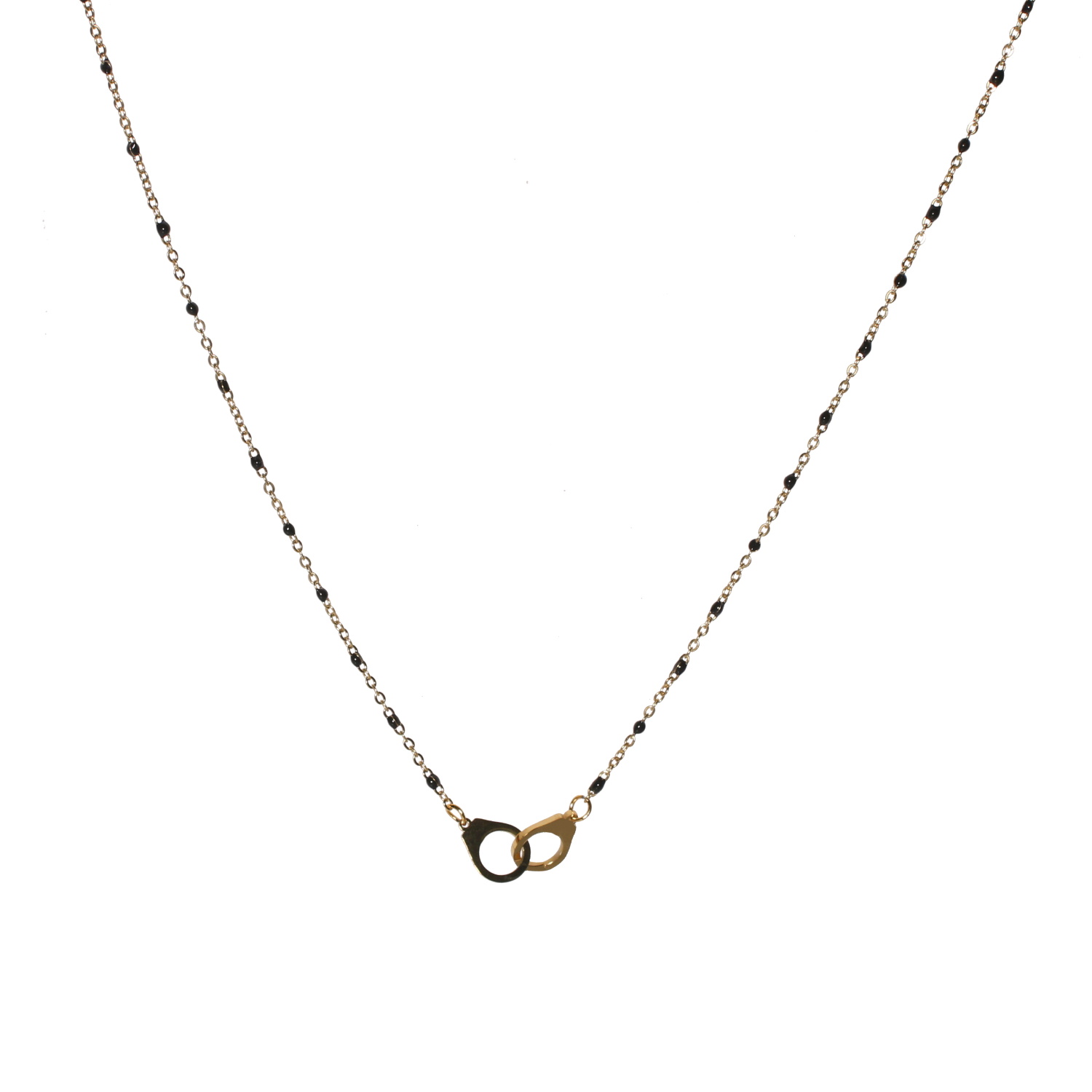 Description Collier composé d'une chaîne avec une paire de menottes en acier doré et de perles en émail de couleur noire. Fermoir mousqueton avec 5 cm de rallonge. Cliquez sur une matière, un thème, une couleur ou une collection pour voir tous les articles associés.