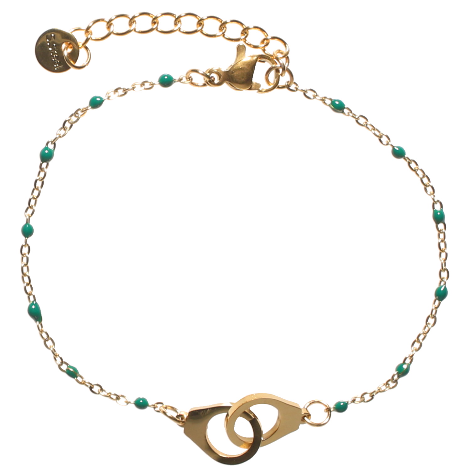 Description Bracelet composé d'une chaîne et d'une paire de menottes en acier doré et de perles en émail de couleur vert. Fermoir mousqueton avec 3 cm de rallonge. Cliquez sur une matière, un thème, une couleur ou une collection pour voir tous les articles associés.