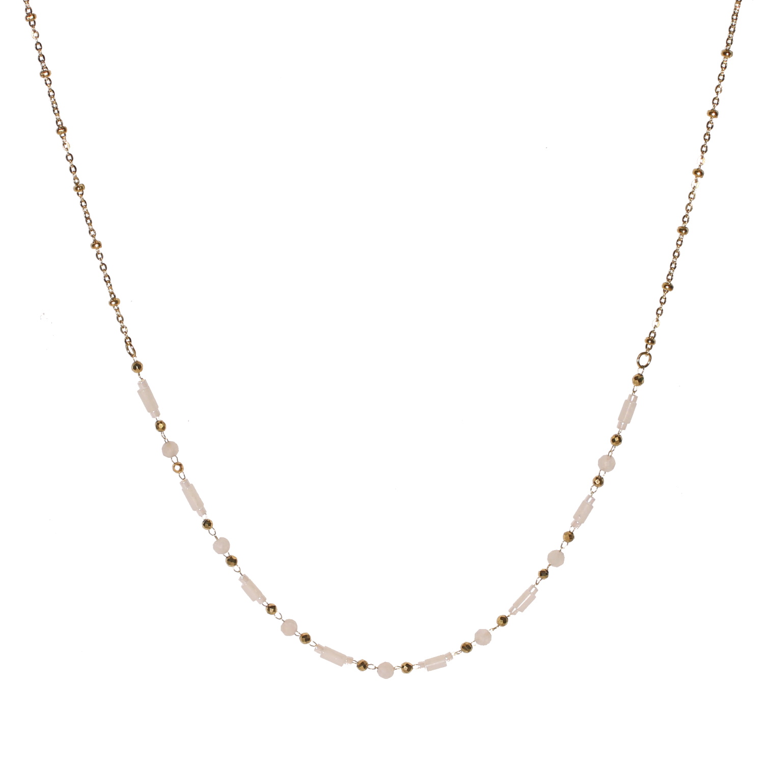 Description Collier composé d'une chaîne avec perles en acier doré et de perles de couleur blanche. Fermoir mousqueton avec 5 cm de rallonge.