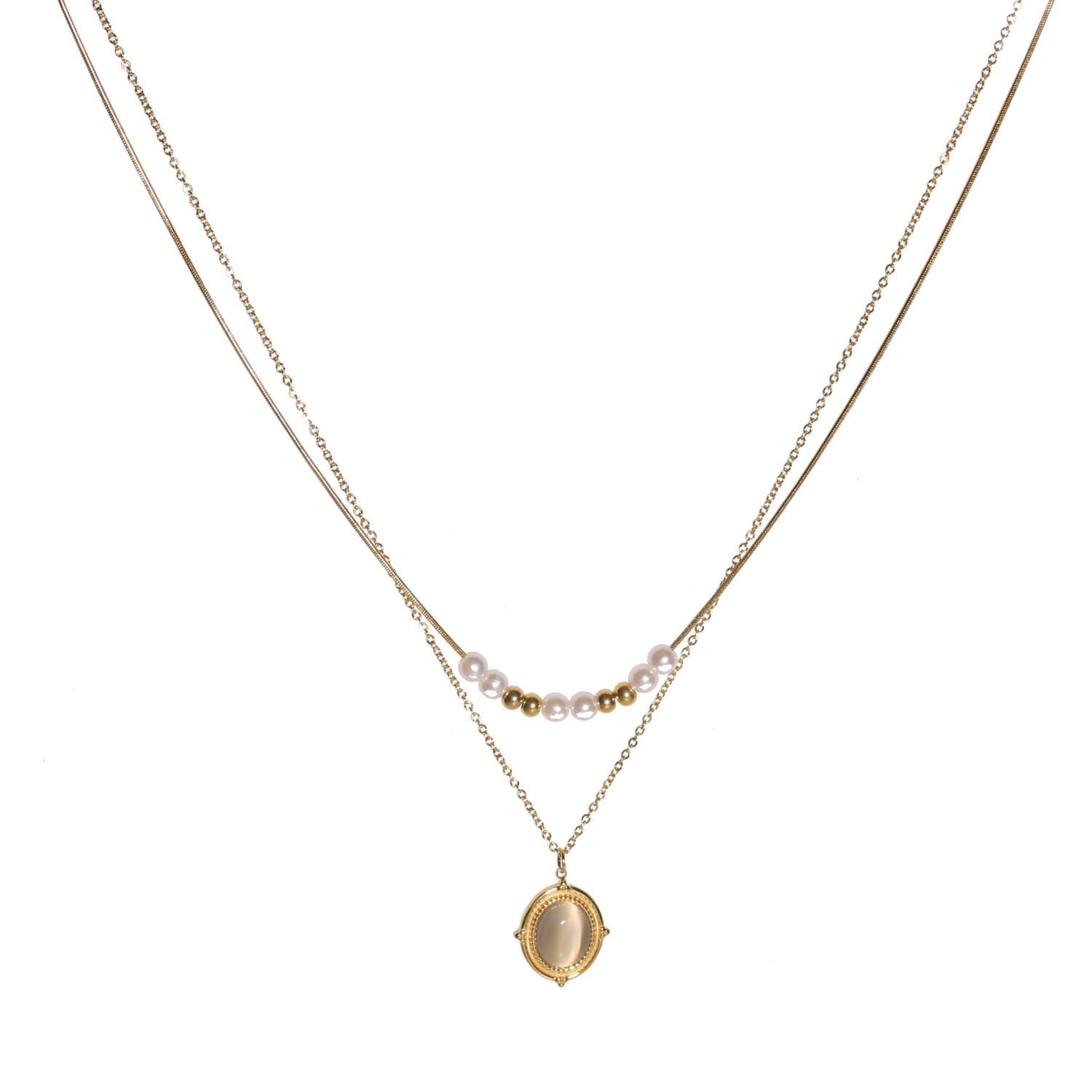 Collier double rangs composé d'une chaîne de 40 cm de long avec perles en acier doré et perles d'imitation, ainsi qu'une chaîne de 42 cm de long en acier doré avec une pendentif ovale surmonté d'un cabochon en cristal blanc.