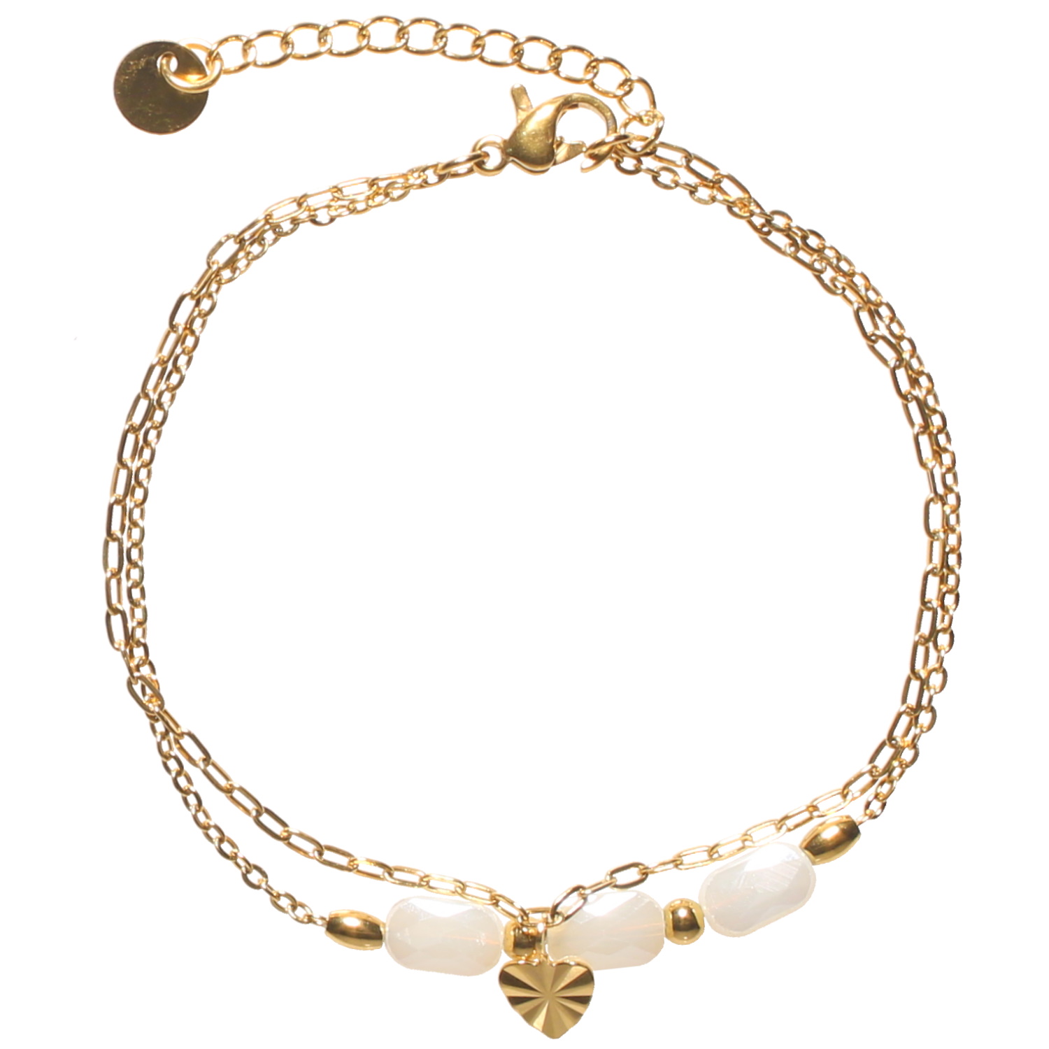 Description Bracelet double rangs composé d'une chaîne avec un pendant en forme de cœur en acier doré et d'une chaîne en acier doré et de trois perles de couleur blanche. Fermoir mousqueton avec 3 cm de rallonge. Longueur 16+3 cm [Guide des tailles] Largeur 8 mm Matière(s) Acier , Rocaille . L'acier utilisé dans la bijouterie existe sous plusieurs qualités. Nous utilisons principalement la qualité 316L, qualité qui est utilisée en chirurgie. Cet acier est donc inoxydable et reste très résistant. Fermoir Mousqueton Couleur(s) dominante(s) Blanc , Doré Public Adolescent , Adulte . Genre Femme , Fille . Saison Indémodable . Thème(s) Amour . Cliquez sur une matière, un thème, une couleur ou une collection pour voir tous les articles associés.