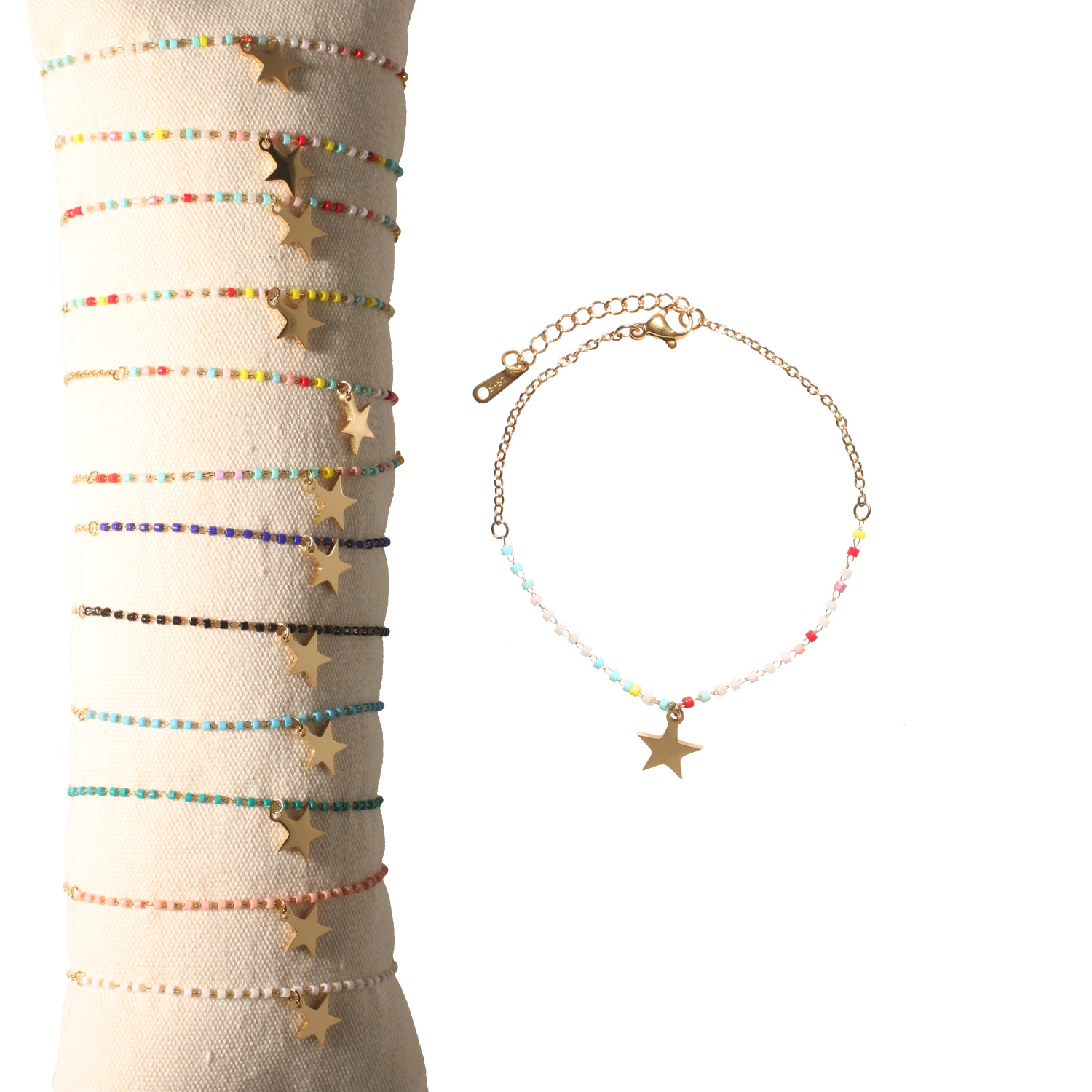 Bracelet fantaisie composé d'une chaîne en acier doré, de perles cylindriques multicolores et d'un pendant en forme d'une étoile en acier doré.