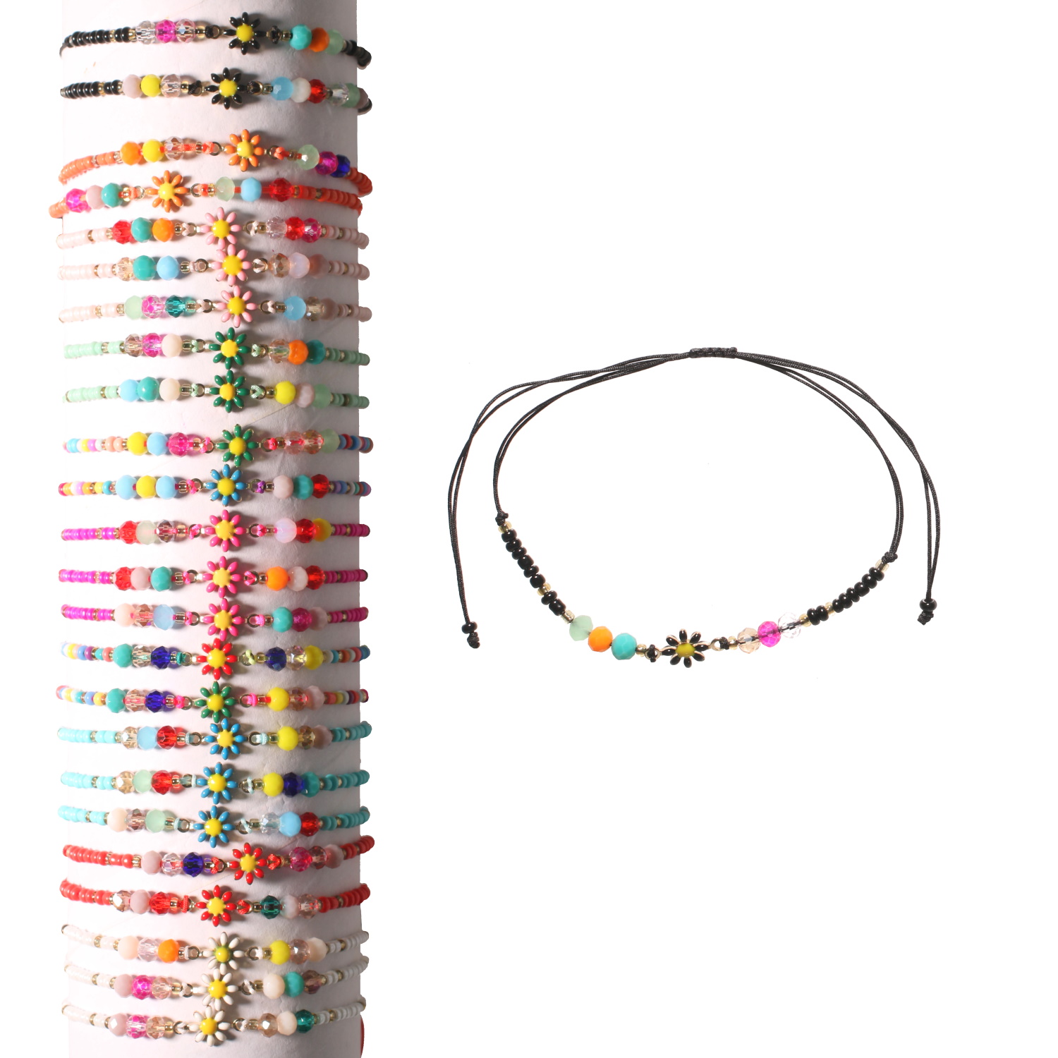 Bracelet fantaisie composé d'un cordon de couleur, de perles miyuki multicolores, de perles multicolores et d'une fleur en métal doré pavée d'émail multicolore.