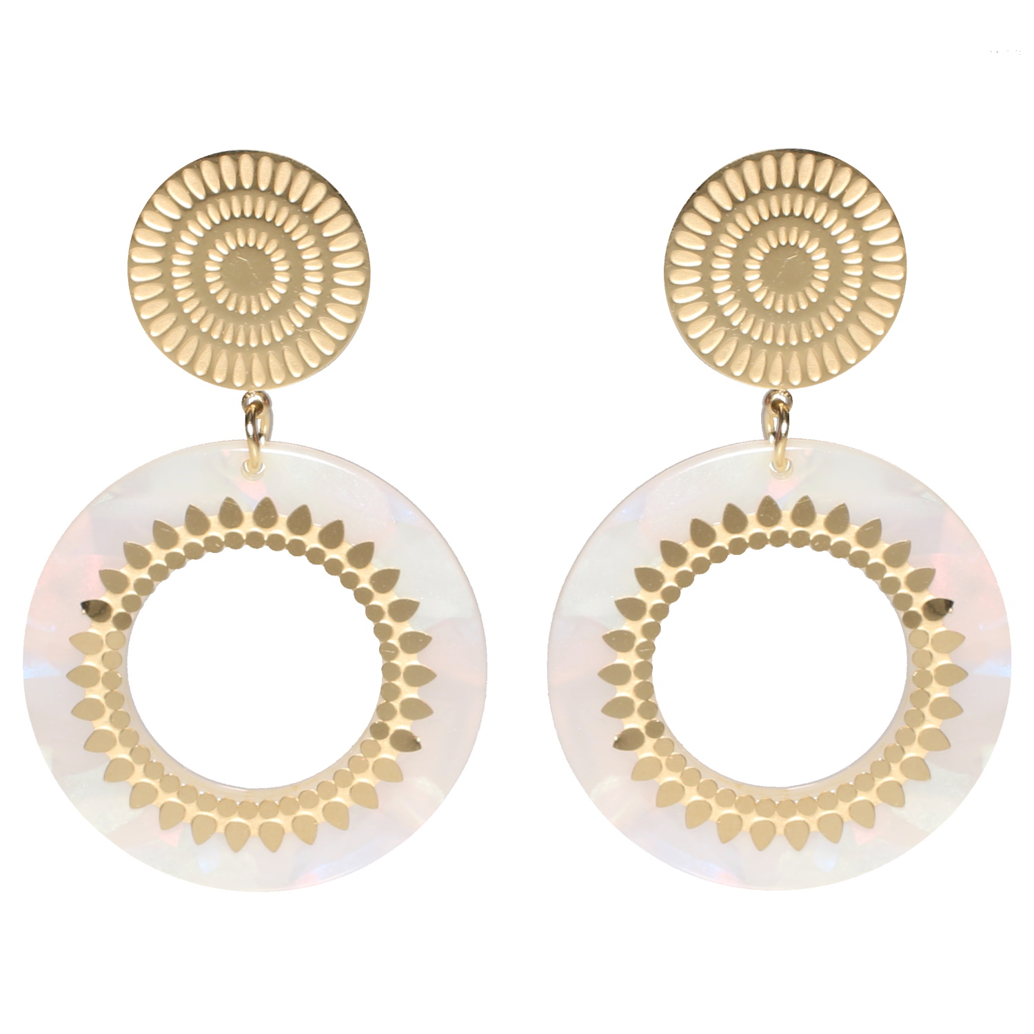 Description Boucles d'oreilles pendantes composées d'une puce ronde avec motifs en acier doré et d'un cercle de couleur blanc pavé de motifs en acier doré. Largeur 38 mm Hauteur 62 mm Matière(s) Acier , Plastique . L'acier utilisé dans la bijouterie existe sous plusieurs qualités. Nous utilisons principalement la qualité 316L, qualité qui est utilisée en chirurgie. Cet acier est donc inoxydable et reste très résistant. Fermoir Tiges poussettes Couleur(s) dominante(s) Blanc , Doré Public Adolescent , Adulte . Genre Femme , Fille . Saison Indémodable . Cliquez sur une matière, un thème, une couleur ou une collection pour voir tous les articles associés.