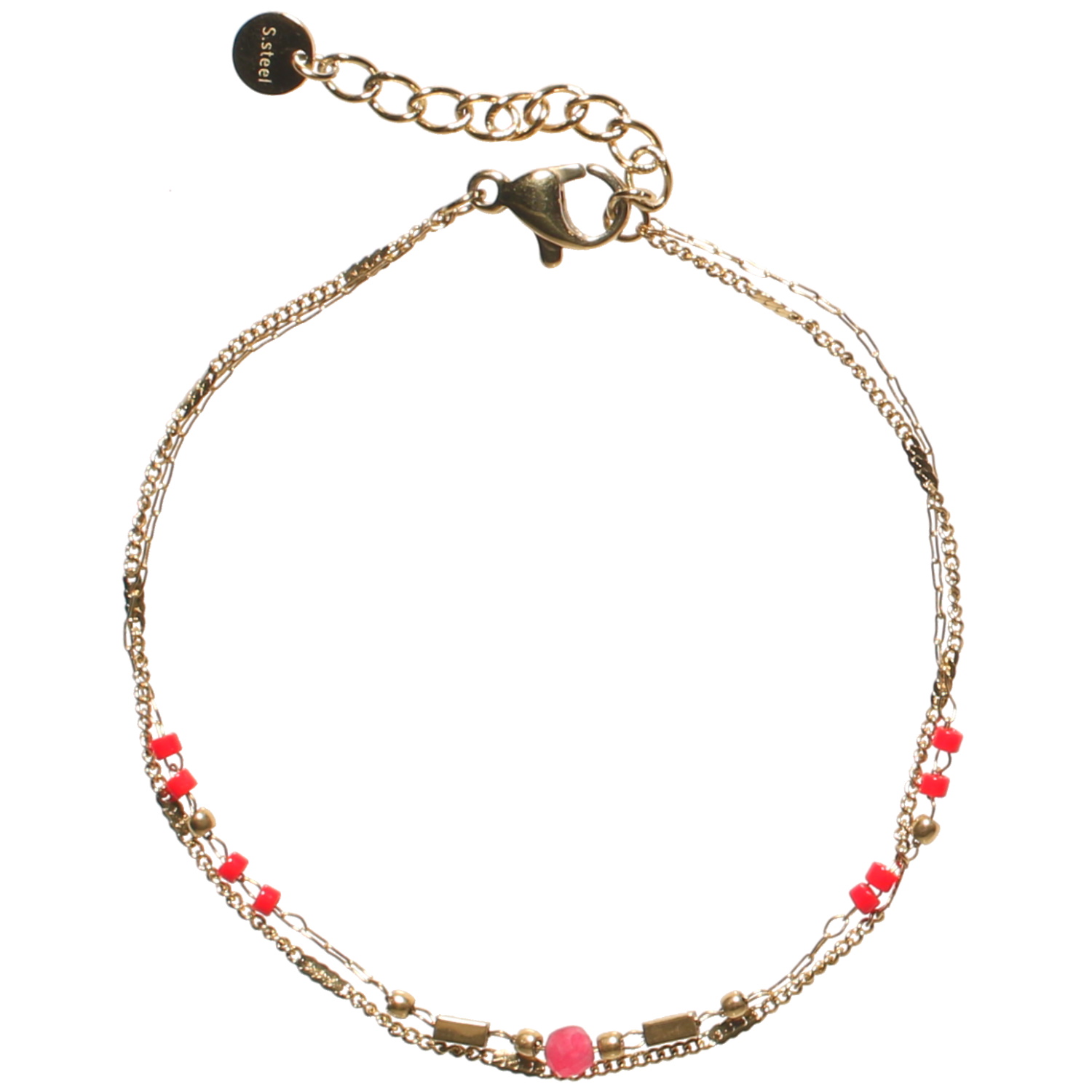 Description Bracelet double rangs composé d'une chaîne en acier doré, ainsi qu'une chaîne en acier doré avec des perles cylindriques de couleur rouge et une perle ronde de couleur rose. Fermoir mousqueton avec 3 cm de rallonge. Cliquez sur une matière, un thème, une couleur ou une collection pour voir tous les articles associés.