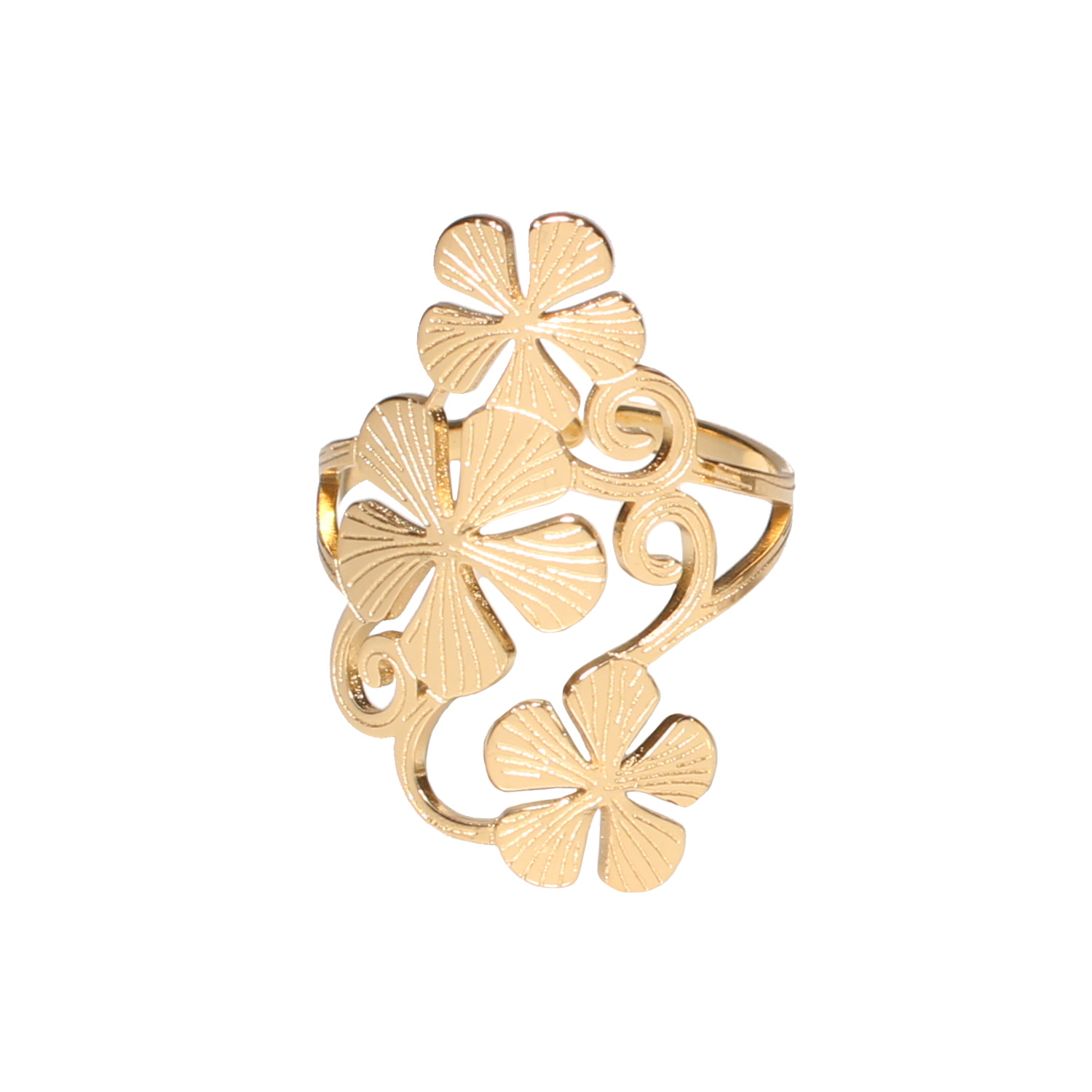 Description Bague ovale composée de trèfles à quatre feuilles en acier doré. Taille ajustable. Largeur 29 mm Matière(s) Acier . L'acier utilisé dans la bijouterie existe sous plusieurs qualités. Nous utilisons principalement la qualité 316L, qualité qui est utilisée en chirurgie. Cet acier est donc inoxydable et reste très résistant. Fermoir Aucun Couleur(s) dominante(s) Doré Public Adolescent , Adulte . Genre Femme , Fille . Saison Indémodable . Thème(s) Fleurs , Nature , Symboles . Cliquez sur une matière, un thème, une couleur ou une collection pour voir tous les articles associés.