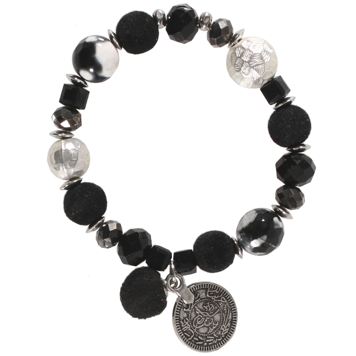 Description Bracelet fantaisie élastique avec breloques en métal argenté, perles synthétiques et boules en textile. Cliquez sur une matière, un thème, une couleur ou une collection pour voir tous les articles associés.