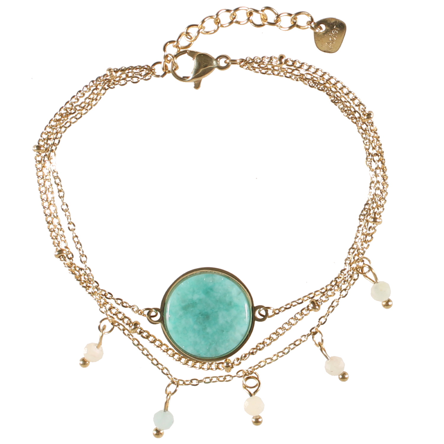 Bracelet triple rangs composé d'une chaîne en acier doré, une chaîne en acier doré avec 5 perles en véritable pierre d'amazonite, ainsi qu'une chaîne en acier doré surmontée d'une pastille ronde pavée d'une véritable pierre d'amazonite.
