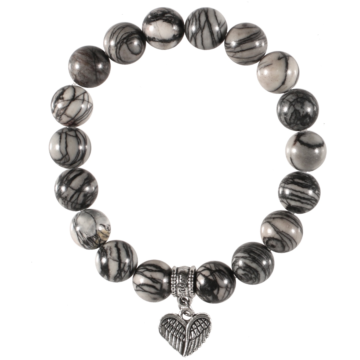 Bracelet élastique avec cœur motif ailes en métal argenté et boules en pierre agate grise.